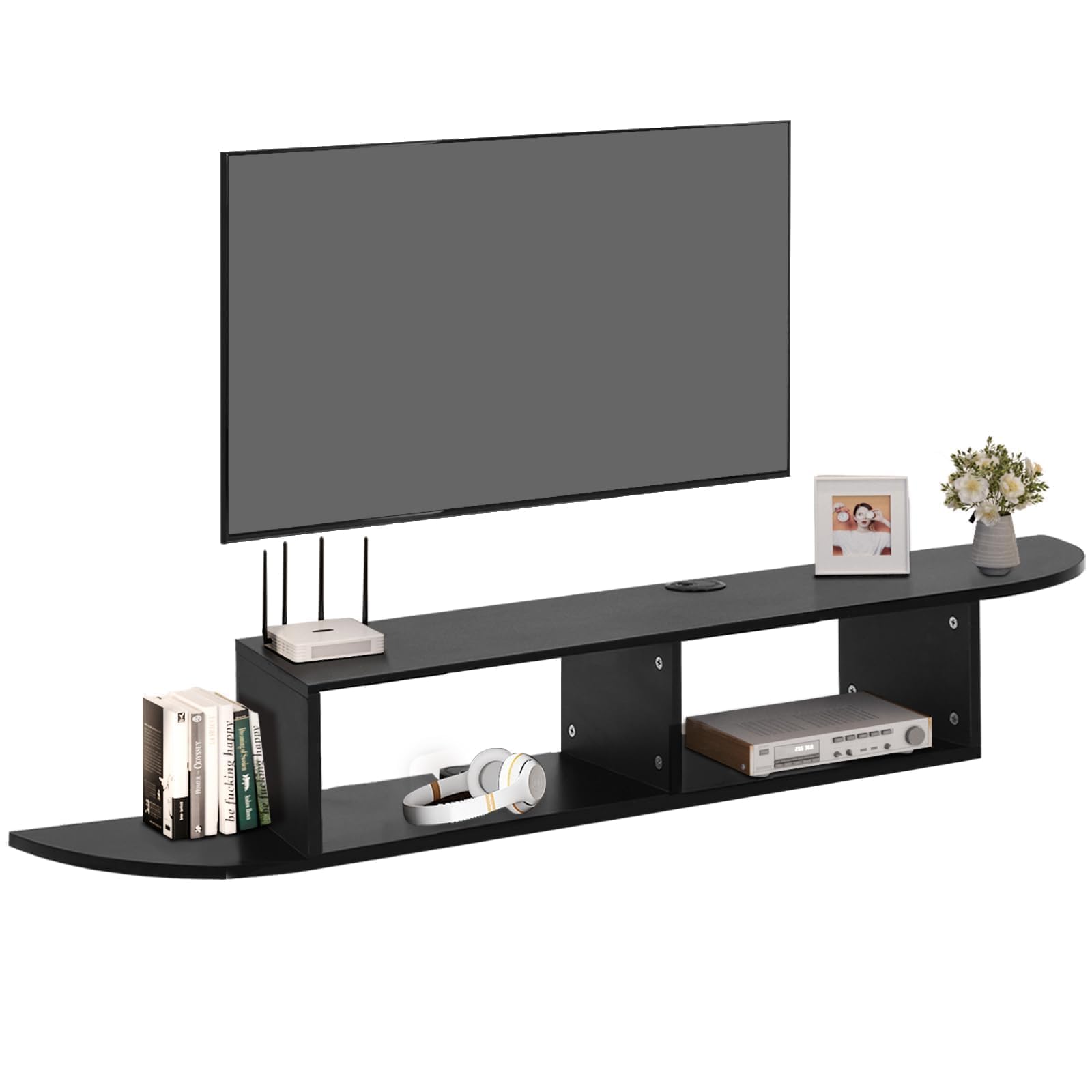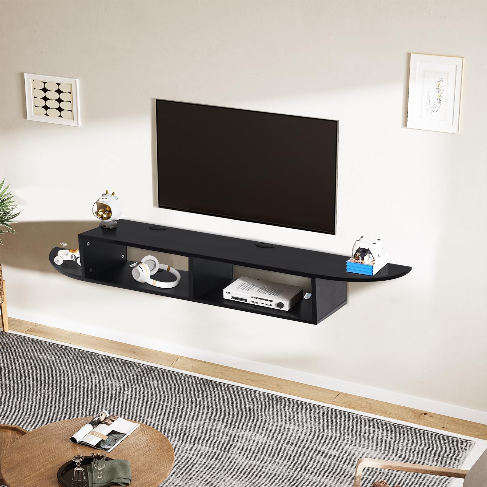 - Space Saving: The wall-mounted design of our floating TV console frees up floor space with open storage for displaying and storing, routers, set-top boxes, DVD players. With space on top of the stand to display your decorations and favorite family photos, this wall mounted TV stand is both functional and decorative