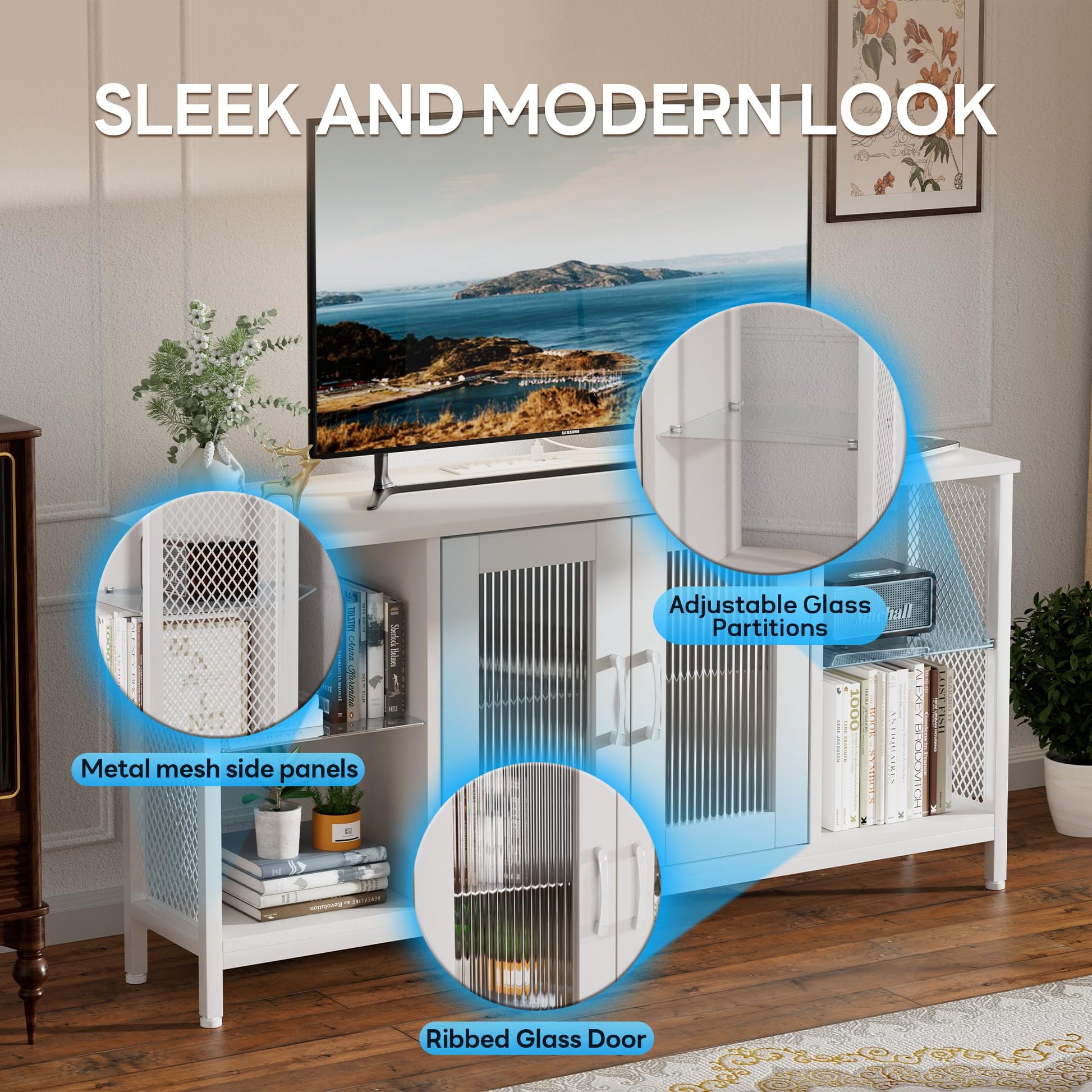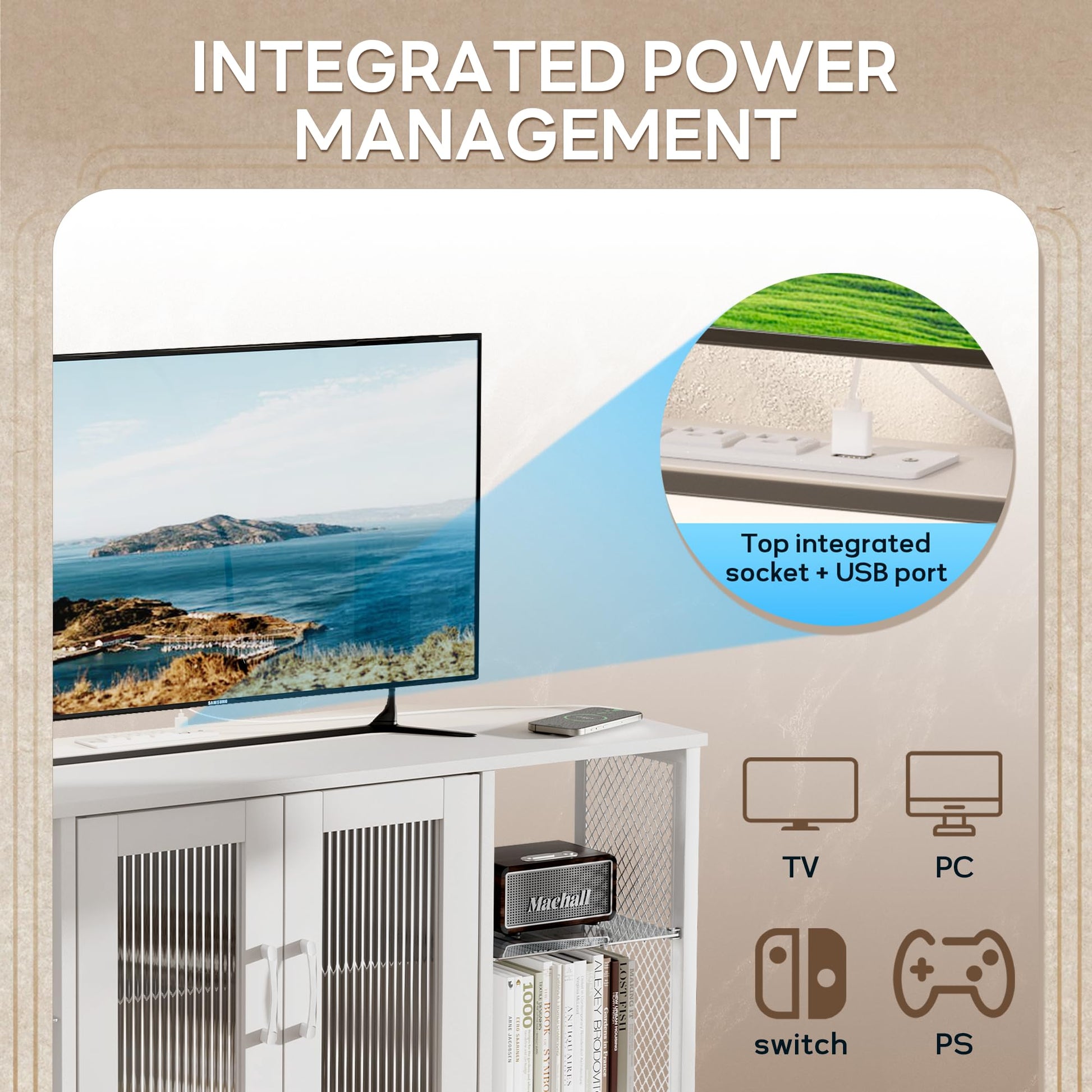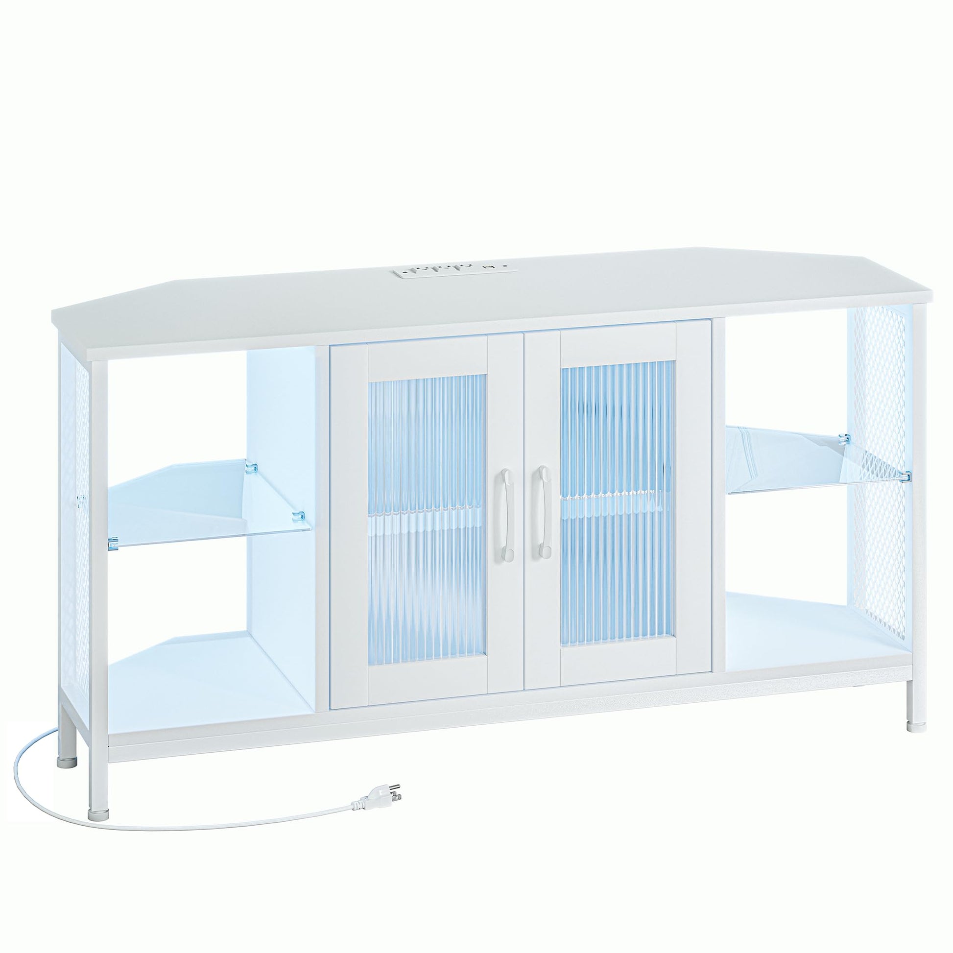 Elevate your entertainment space with this modern 46-inch TV stand, designed to accommodate 32 to 55-inch televisions. Featuring integrated LED lighting, glass storage cabinets, and a built-in power outlet, this entertainment center combines functionality with contemporary style.