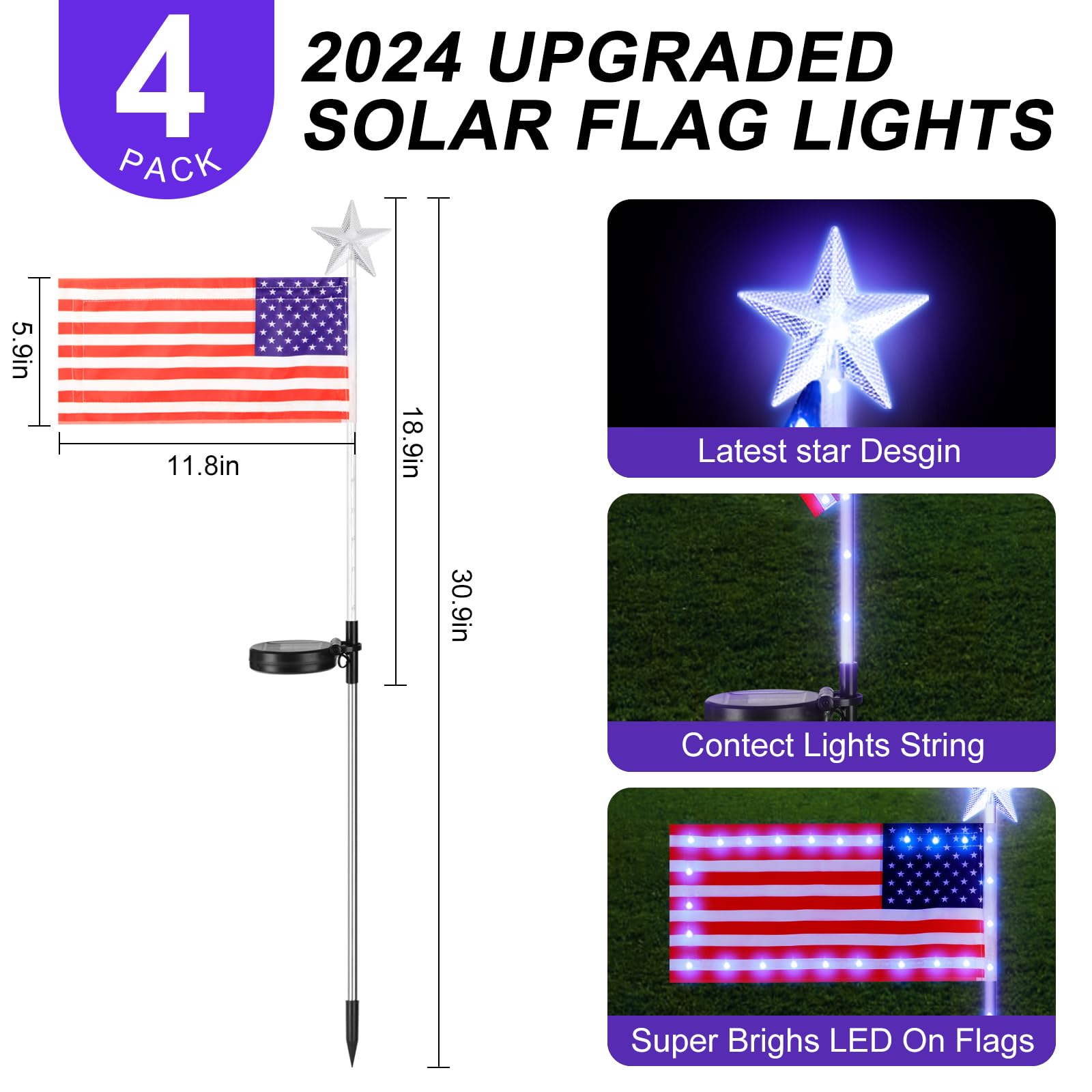 - 2024 Upgraded American Solar Flag Lights Our 2024 upgraded American flag lights features an enlarged flag size of 11.8 x 5.9 inches. We equipped with LED copper wire fairy lights on the this Solar flag Lights surface. And 2 different lighting Models, Making outdoor flag lights more prominent in the garden.
