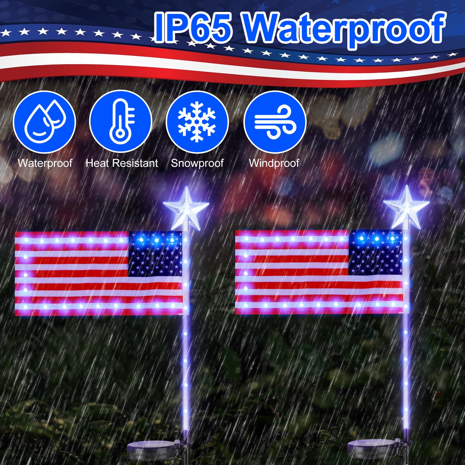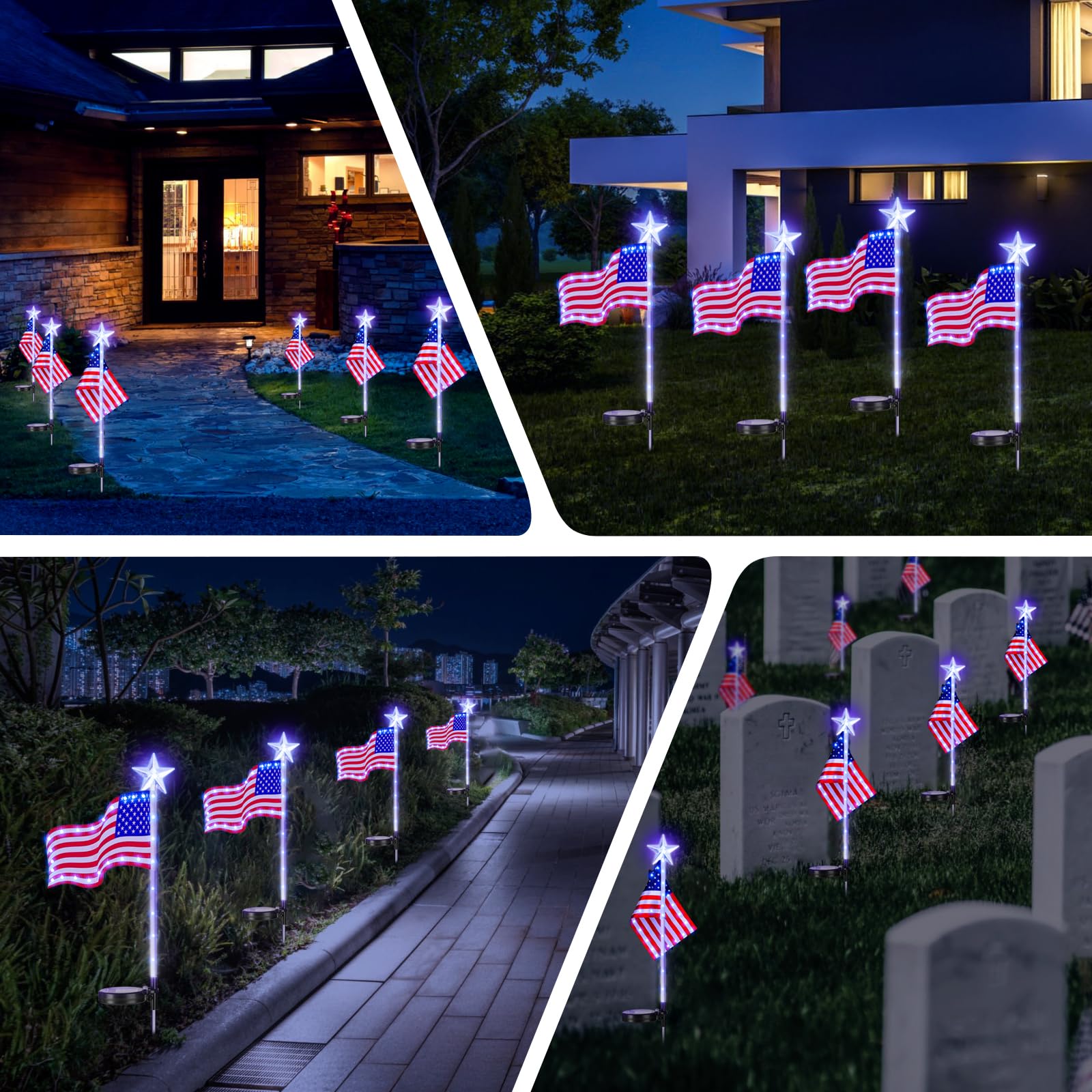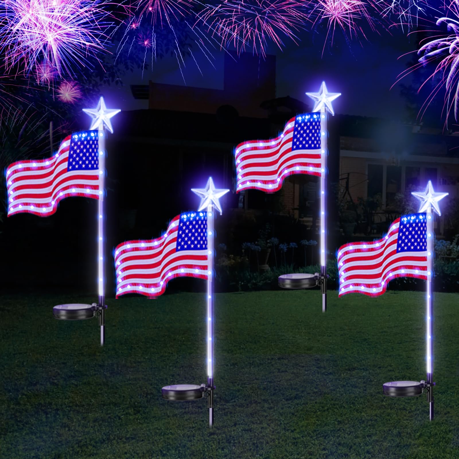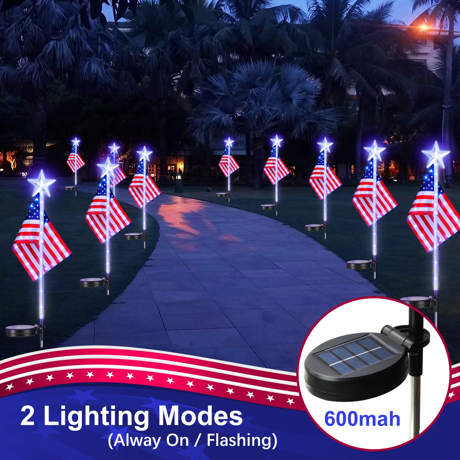 - 4th of July Decorations Lights This package includes 4 sets of patriotic pathway lights. Perfect for special occasions such as July 4th, Independence Day, Memorial Day, National Day, Veterans Day, American Flag Day, and even Christmas. These solar flag lights are not just a simple addition to your outdoor decor; they are the quintessential embodiment of patriotism.
