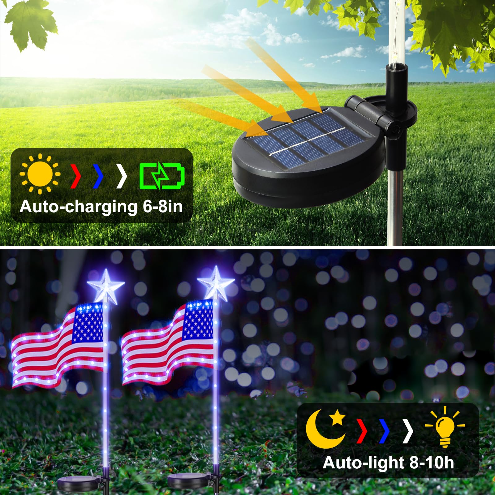 - Energy-Saving Solar Powered Our patriotic solar lights powered by solar energy, no electricity bills very eco-friendly. This stake flag lights with 600mah solar panel and larger capacity rechargeable battery, Can save enough energy to support long time illumination, charging 6-8 hours can long last for 8-10 hours, You can place The Us flag lights anywhere without the need for an outlet.