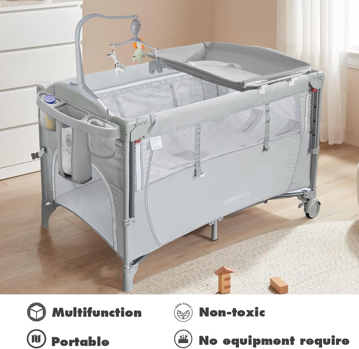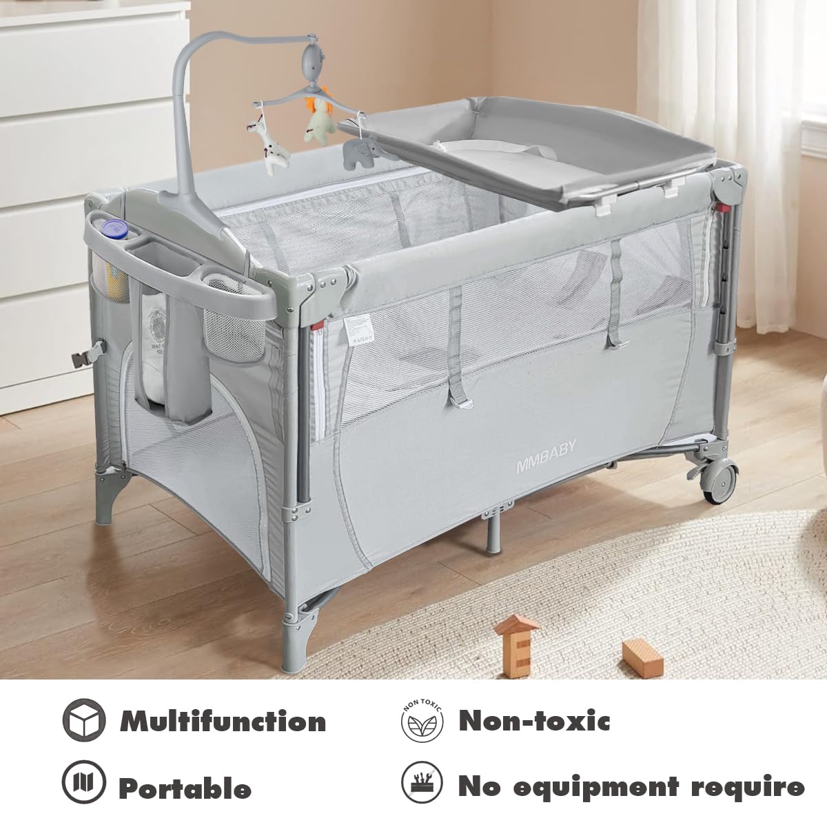 - This multifunctional baby pack n play can serve as a baby rock bassinet, bedside crib, activity center, U-shaped diaper changing table, and baby crib. Whether it provides a comfortable resting place for your cute baby, or daily activities and care, this 5-in-1 crib is the best choice. Other than that, the U-shaped diaper changing table comes with a safety belt to prevent the baby from rolling off.