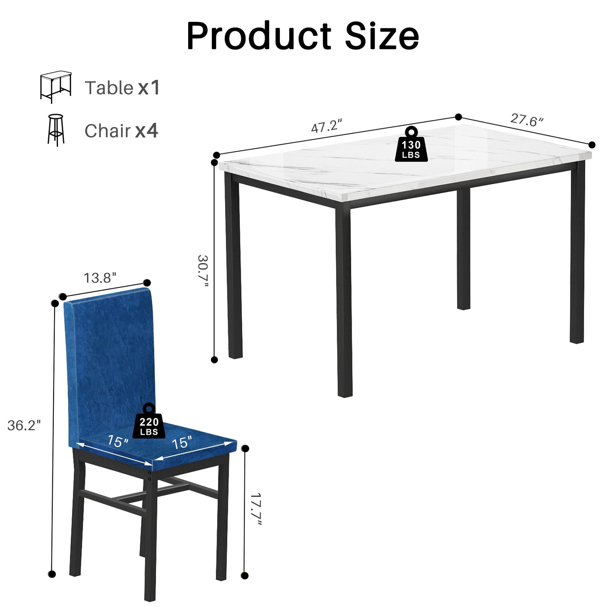 The 47.2-inch table provides ample space for four diners while maintaining a compact footprint ideal for dining rooms, kitchens, or breakfast nooks. The sleek silver frame complements the elegant marble-effect surface, while the rich blue velvet chairs add a touch of contemporary luxury.