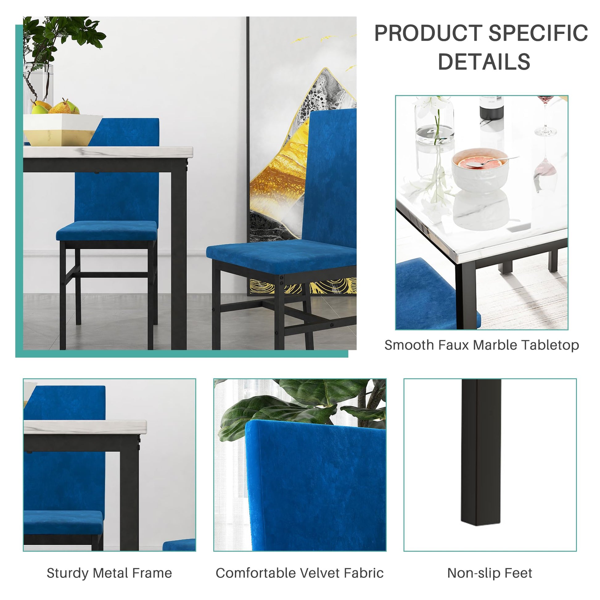 Elevate your dining space with this sophisticated 5-piece dining set, featuring a stunning faux marble tabletop and four luxuriously upholstered velvet chairs. The modern design combines premium materials with exceptional comfort, creating an inviting atmosphere for family meals and entertaining guests.