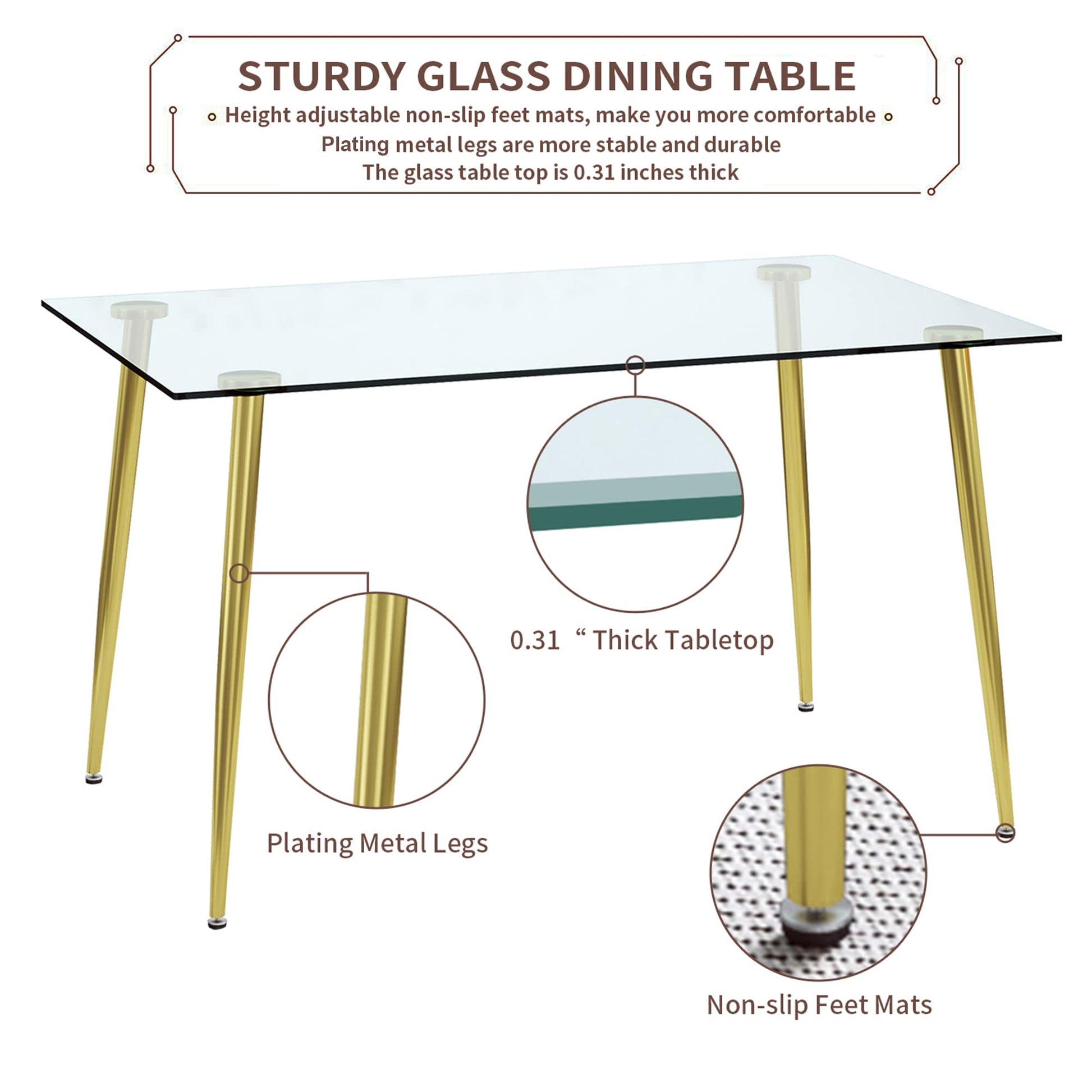 - The table top of this dining table set is made of tempered glass and stainless steel plating gold metal legs, ensuring strong support, and it is easy to clean if there are water, coffee, oil, or other residues on the table. The addition of non-slip feet to move the table to avoid scratching the floor.