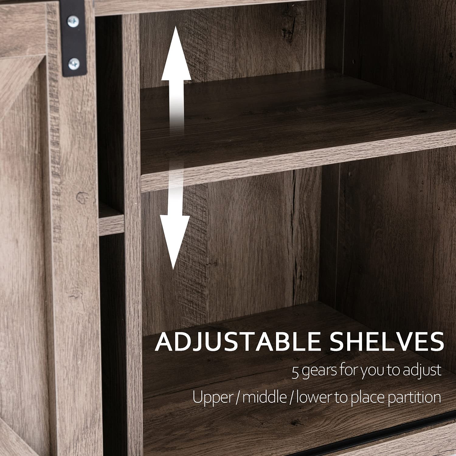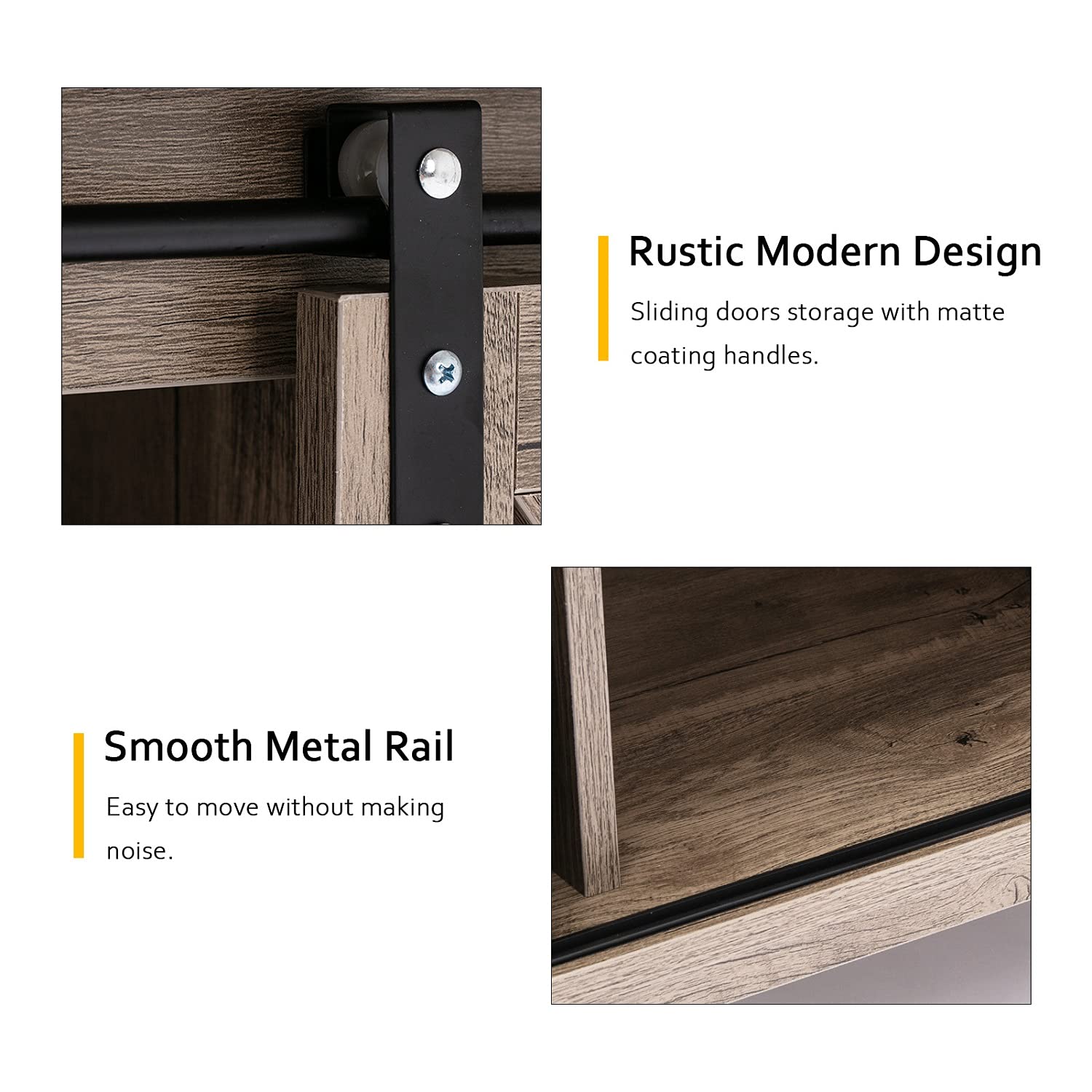 - Farmhouse Rustic Entertainment Centers The TV stand with storage cabinet featured two sliding barn doors for a blend of open and closed storage. Sliding barn doors and their flexibility allow easy access to all cabinets. Beyond its functionality, the symmetrical design with the finest wood grain also matches the rustic sense of style in your living room.