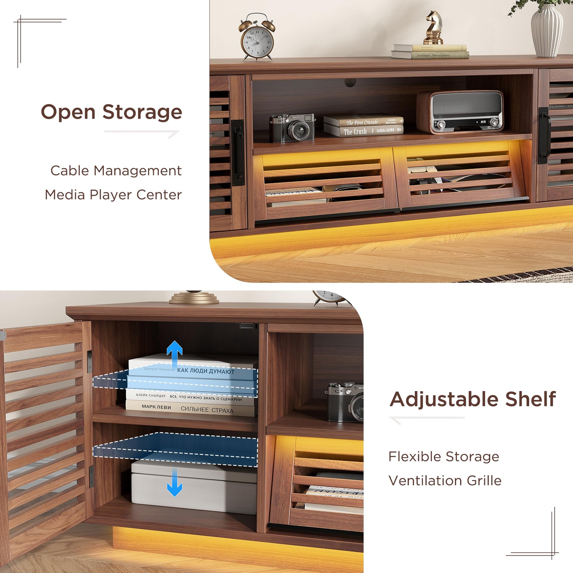 The rich walnut brown finish with wood grain texture complements a variety of interior styles, from modern farmhouse to industrial aesthetics. Multiple storage compartments keep media devices, gaming consoles, and accessories organized and easily accessible while maintaining a clean, uncluttered appearance.