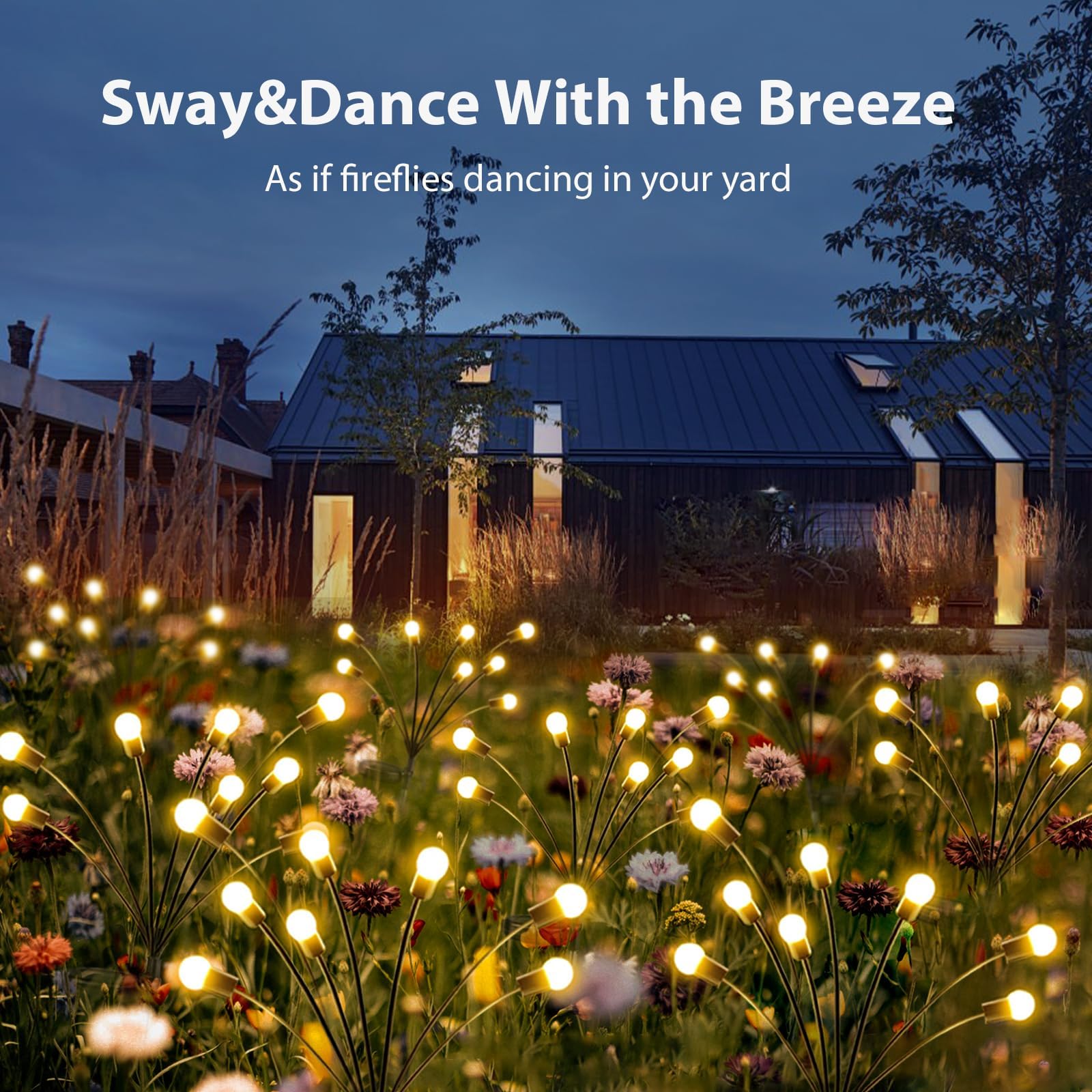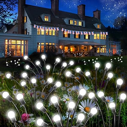 - Newly Upgraded Design, Beautiful Solar Garden Lights for Great Ambience: This solar garden lights are designed with flexible branches and bright LED bulbs, which can sway and dance with the wind and looks like fireflies flying in the yard. The outdoor solar lights have 2 lighting modes ( Steady On & Flash Mode) which can add a lot of vitality to your garden, and create a romantic atmosphere.