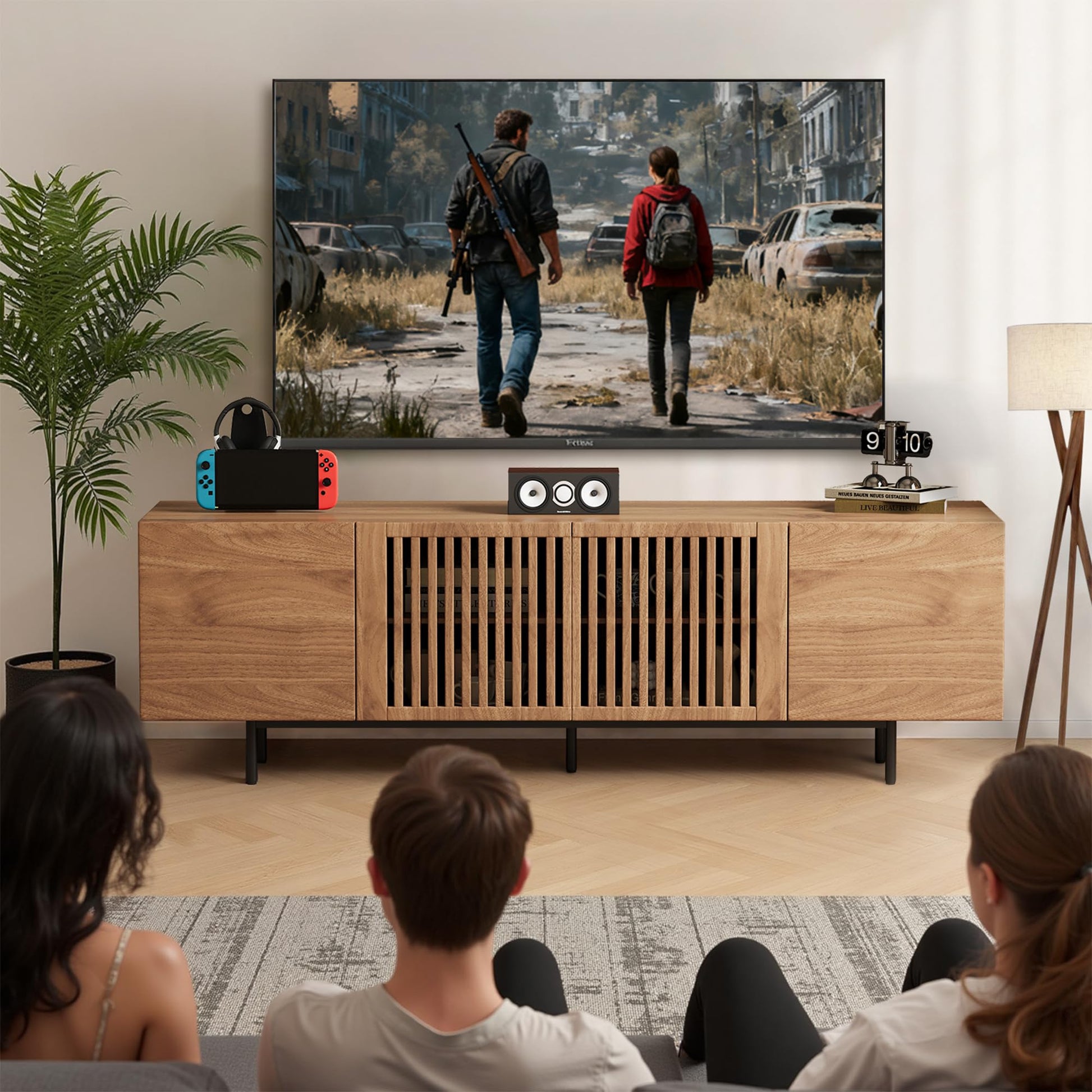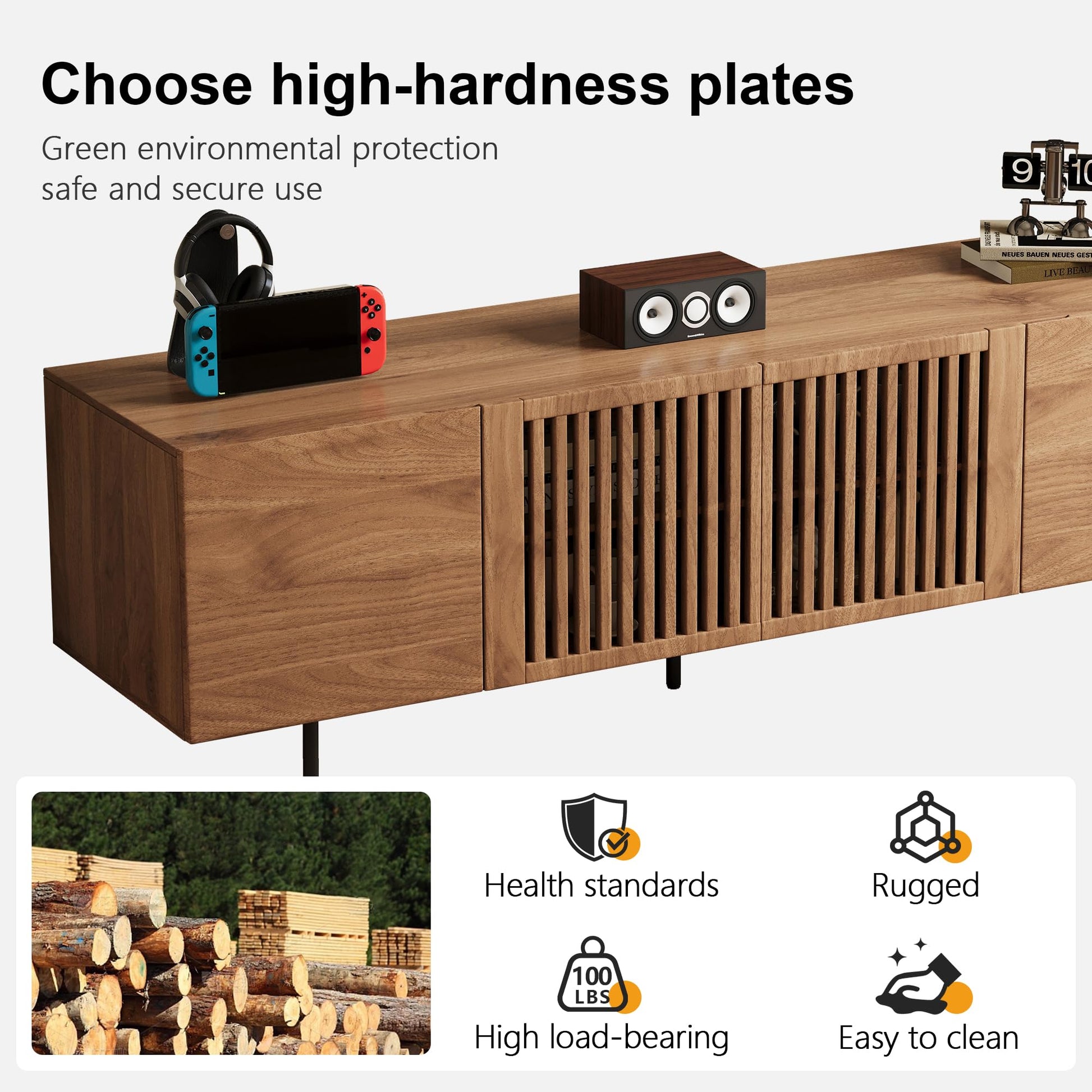 Elevate your living space with this sophisticated 70.87-inch TV stand that seamlessly blends timeless mid-century design with modern functionality. Crafted with rich walnut finish and distinctive grille doors, this entertainment center accommodates TVs up to 80 inches while providing ample storage for all your media essentials.