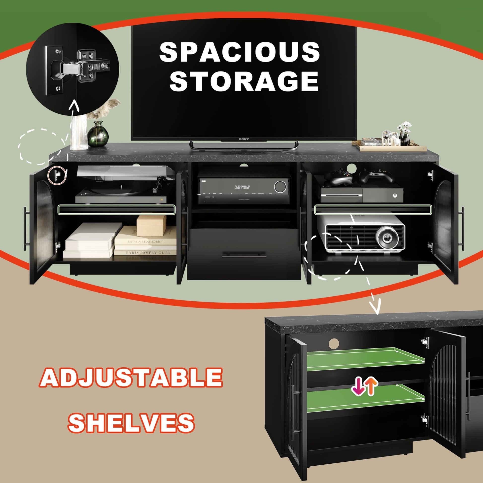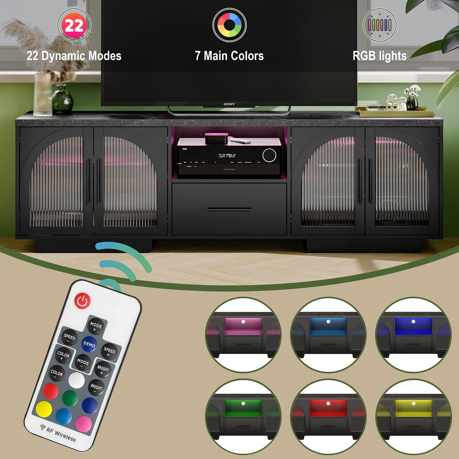 Transform your living room with this sophisticated 70-inch TV stand that combines contemporary design with practical functionality. Featuring adjustable LED lighting and elegant arched glass doors, this entertainment center creates an impressive focal point while keeping your media essentials organized.
