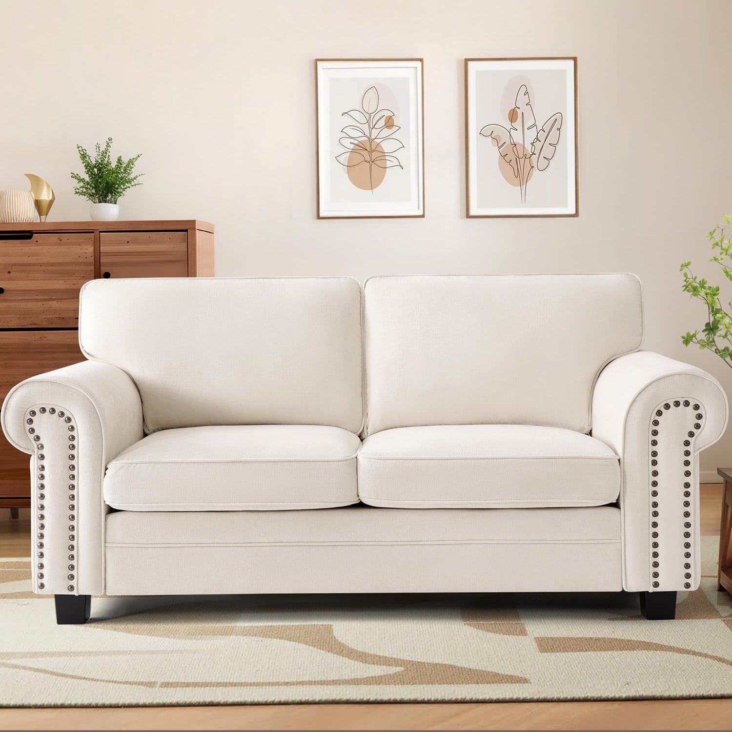 - Attractive Sofa Design: This mid-century vintage minimalist fabric sofa has an overall compact structure and smooth lines. The armrests are a vintage classic brass stud design with an upscale feel. Measures 33.9 inches (D) x 71 inches (W) x 35 inches (H). Perfect for smaller spaces such as living rooms, bedrooms, offices, apartments and more