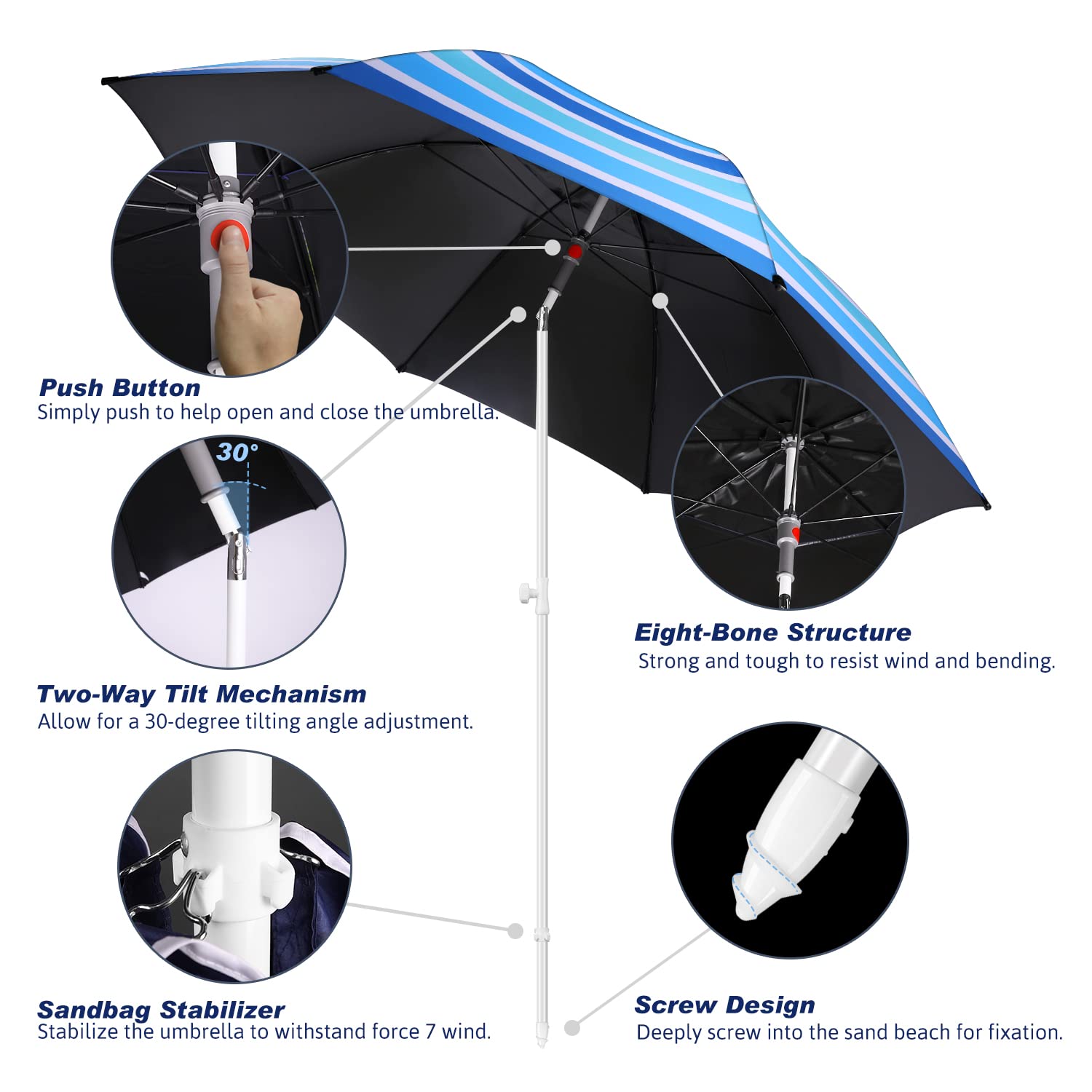 8FT Large Beach Umbrella Level 7 Wind Resistance Design, Sand Anchor, Sand Bag