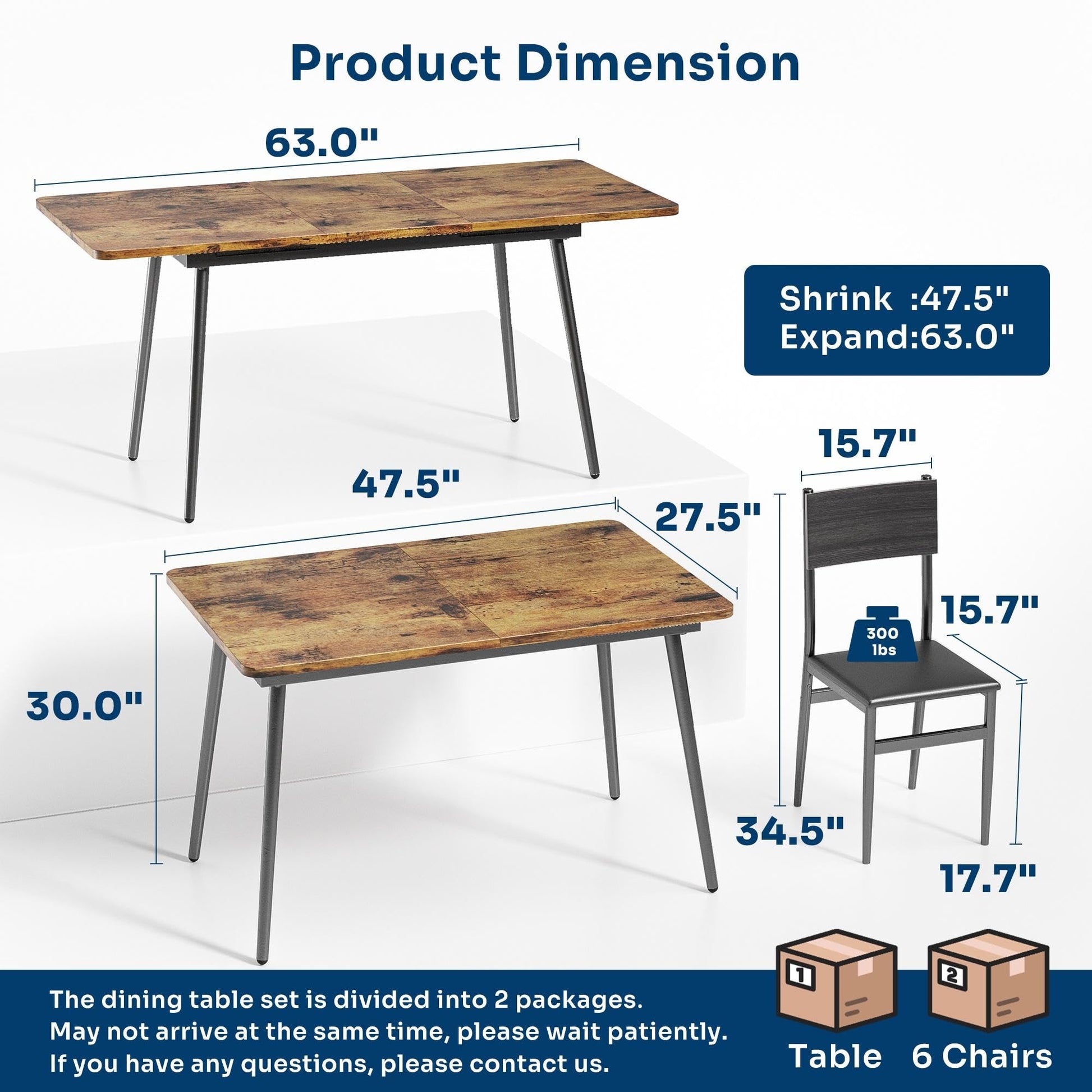 - Perfect for 4-6 people: The extendable dining room table set includes 1 table and 6 upholstered chairs for 4-6 people. Table dimensions: 63'' L x 27.5'' W x 30'' H(extended), 47.5'' L x 27.5'' W x 30'' H (normal). You can decide whether or not to expand the tabletop depending on the number of diners. Chair dimension: 15.7'' L x 15.7'' W x 34.5'' H. Maximum table capacity: 300 lbs. Maximum chair capacity: 300 lbs.
