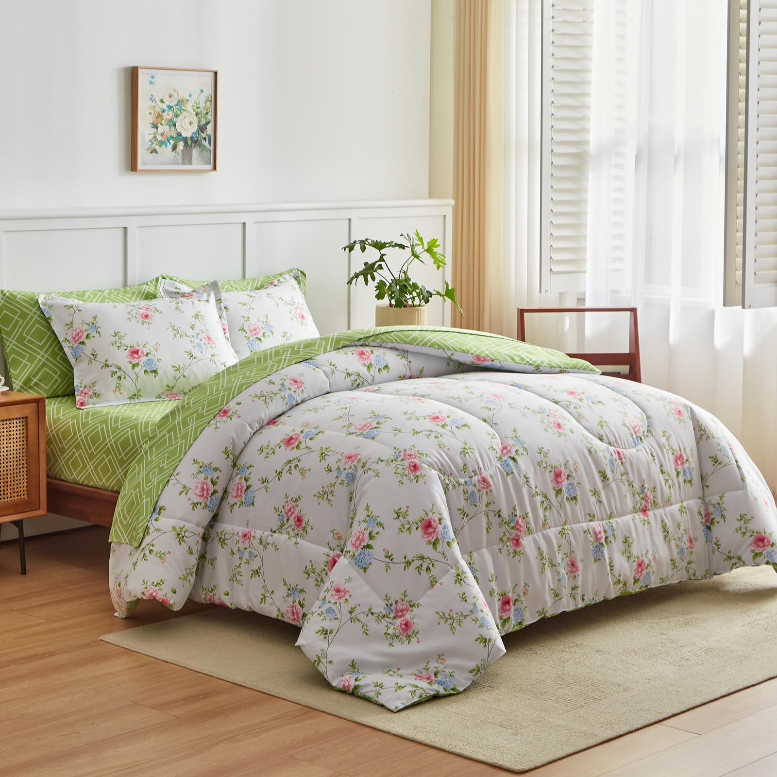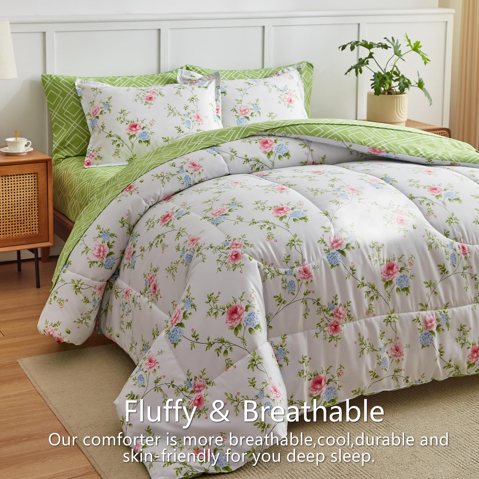 Bed in a Bag 7 Pieces - Floral Print - Soft Microfiber, Reversible Bed Comforter Set