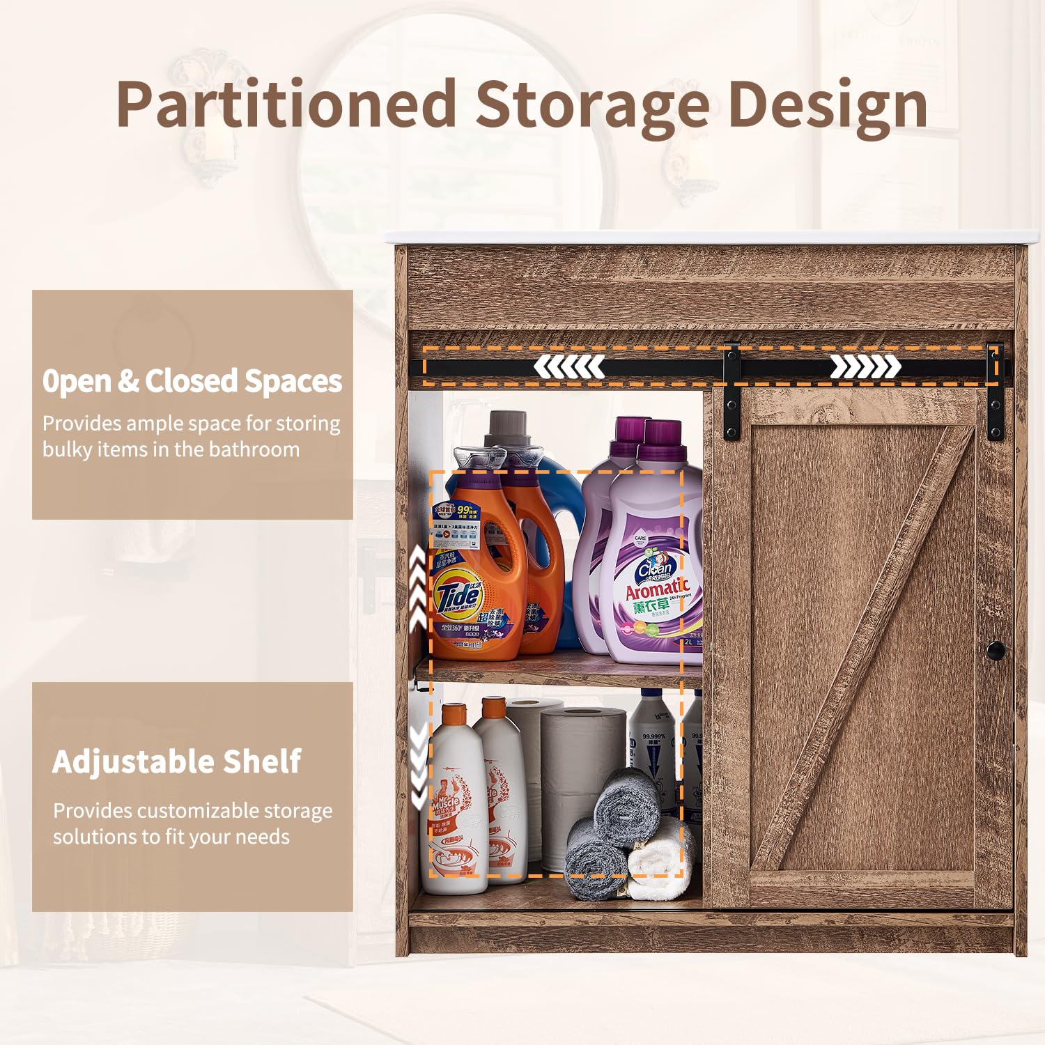 Aitjunz 30" Farmhouse Bathroom Vanity with Sink, Freestanding Modern Bathroom Storage Vanity Cabinet w/Sliding Barn Door, 3 Drawers & Adjustable Shelves, Light Brown
