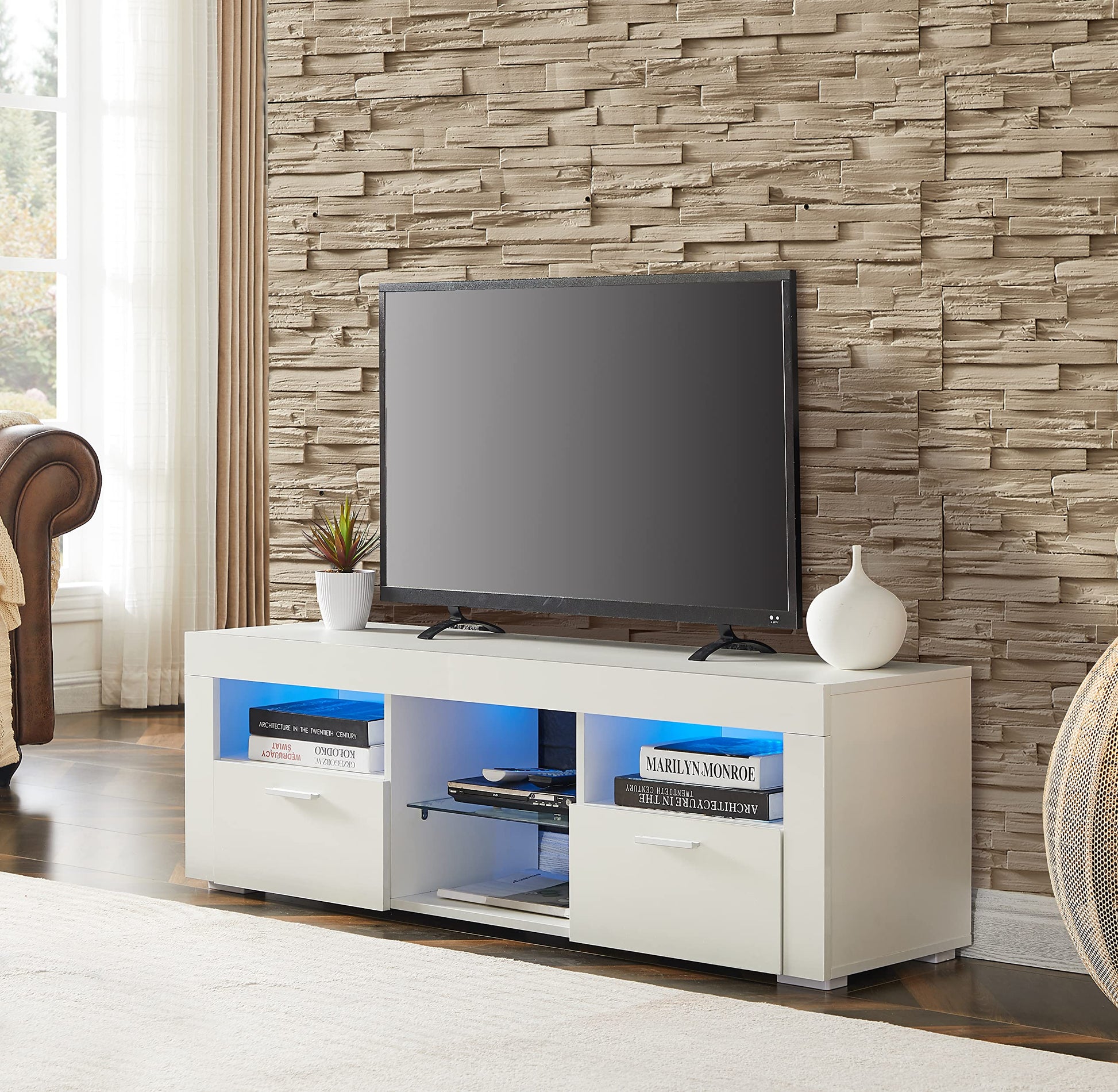 - White TV stand is synonymous with trendy design elements, built-in 16 adjustable lighting, with 4 flashing effects, glass shelving and open storage space.