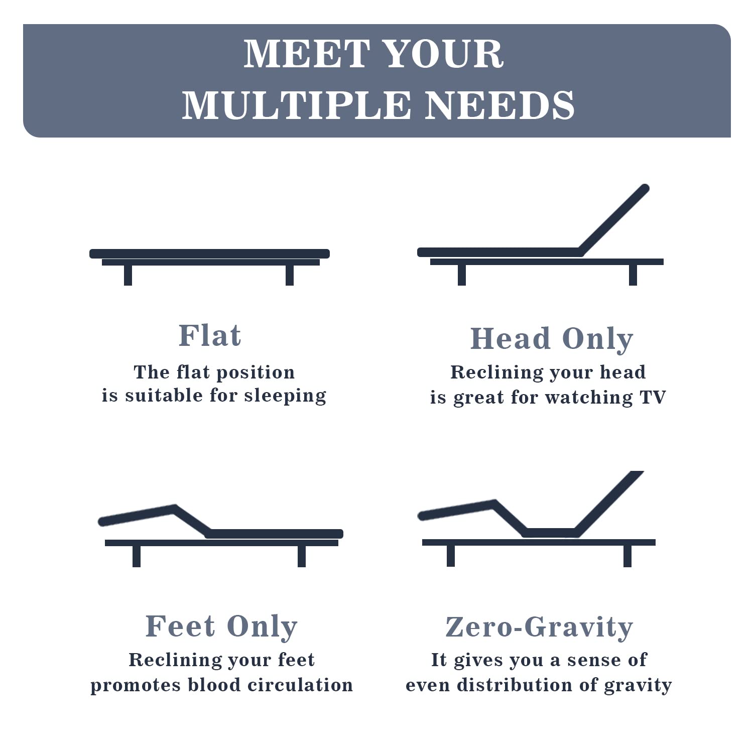 - Four Adjustment Modes: Back lifting mode supports the waist to make watching more comfortable; Leg lifting mode, lifts the leg to relieve pressure and relieve acid swelling; Lie down mode to improve sleep quality; Simultaneous head and foot rise mode, pulls up the spine, relieve waist and neck pain.