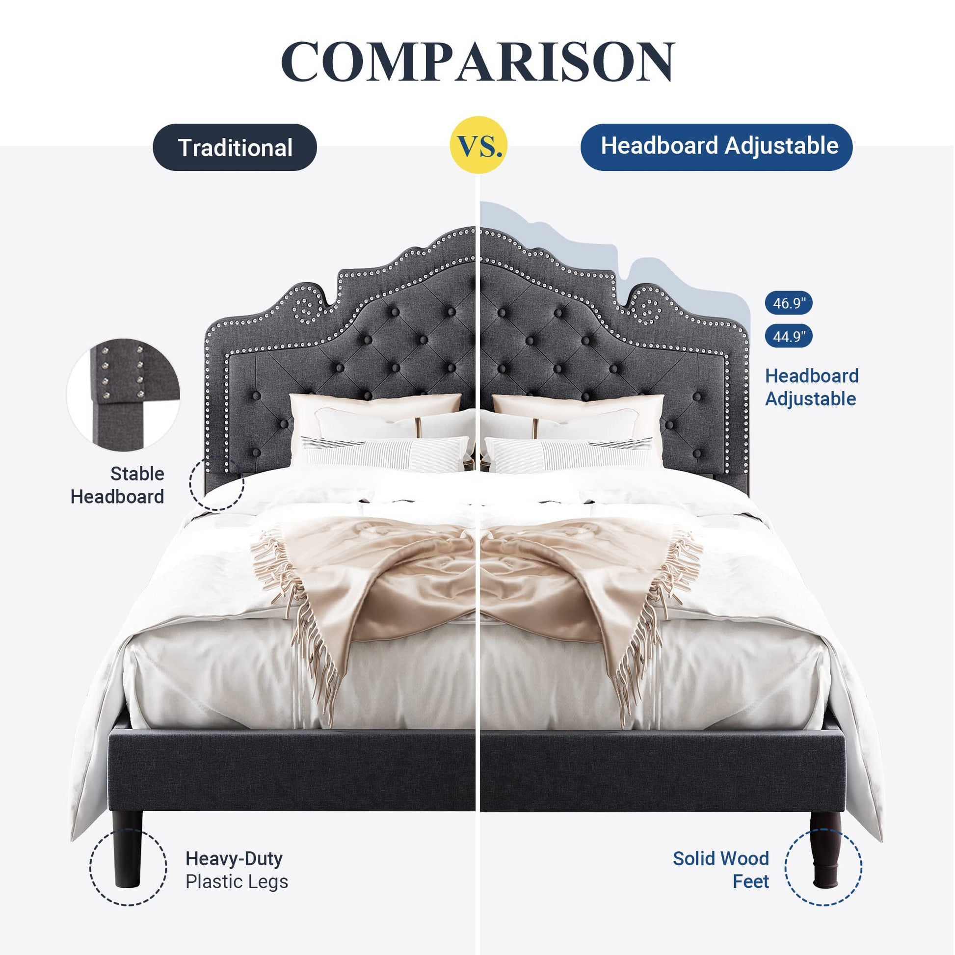 • Adjustable Tiara Headboard – Elegant design with adjustable height for added comfort and style.