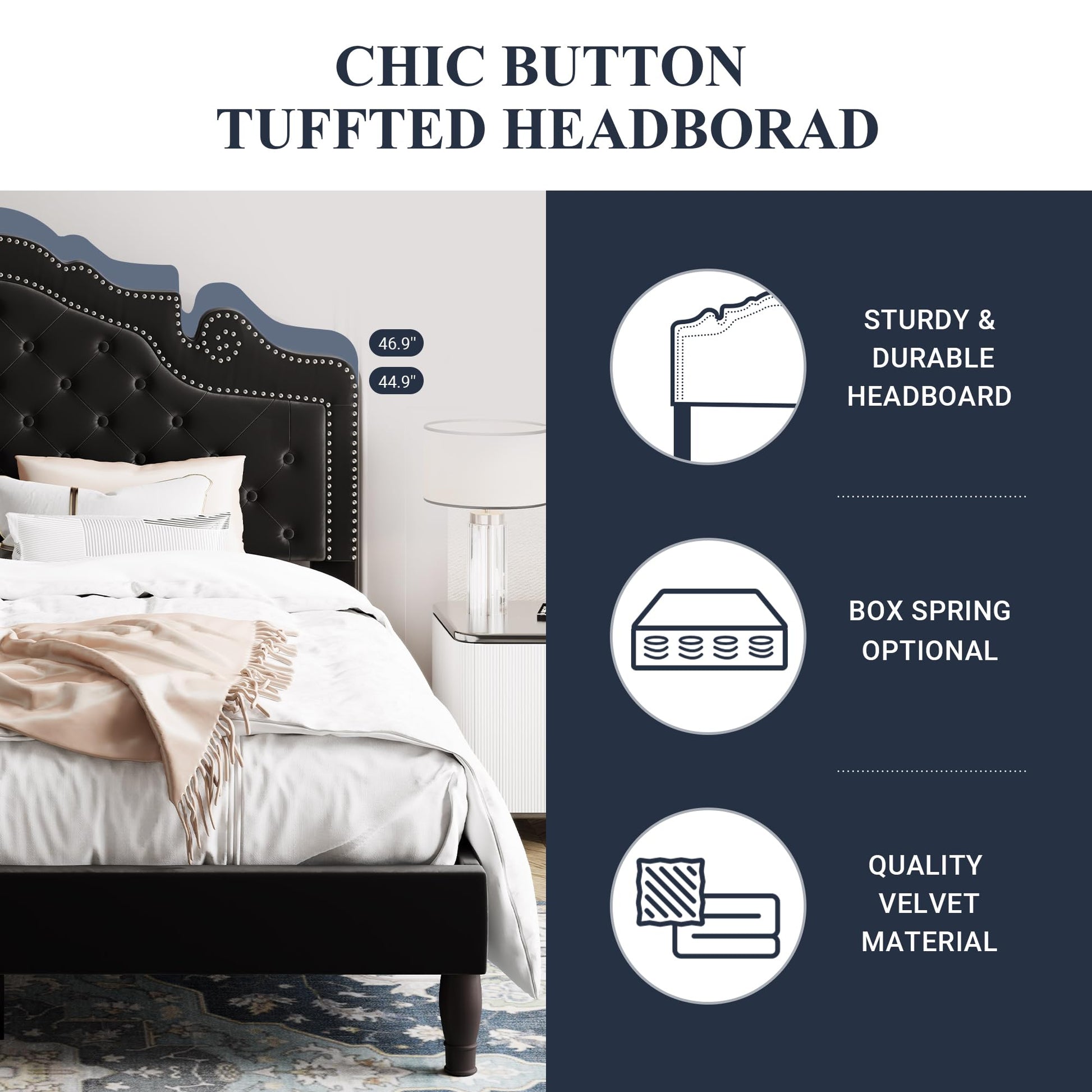 - Elegant Design: The full bed frame with headboard is beautifully upholstered in a soft and luxurious velvet and features a tiara nailhead trim design, used Eco-friendly materials not only add style and a touch of glamour are a perfect fit for any bedroom decor, from classic to contemporary.