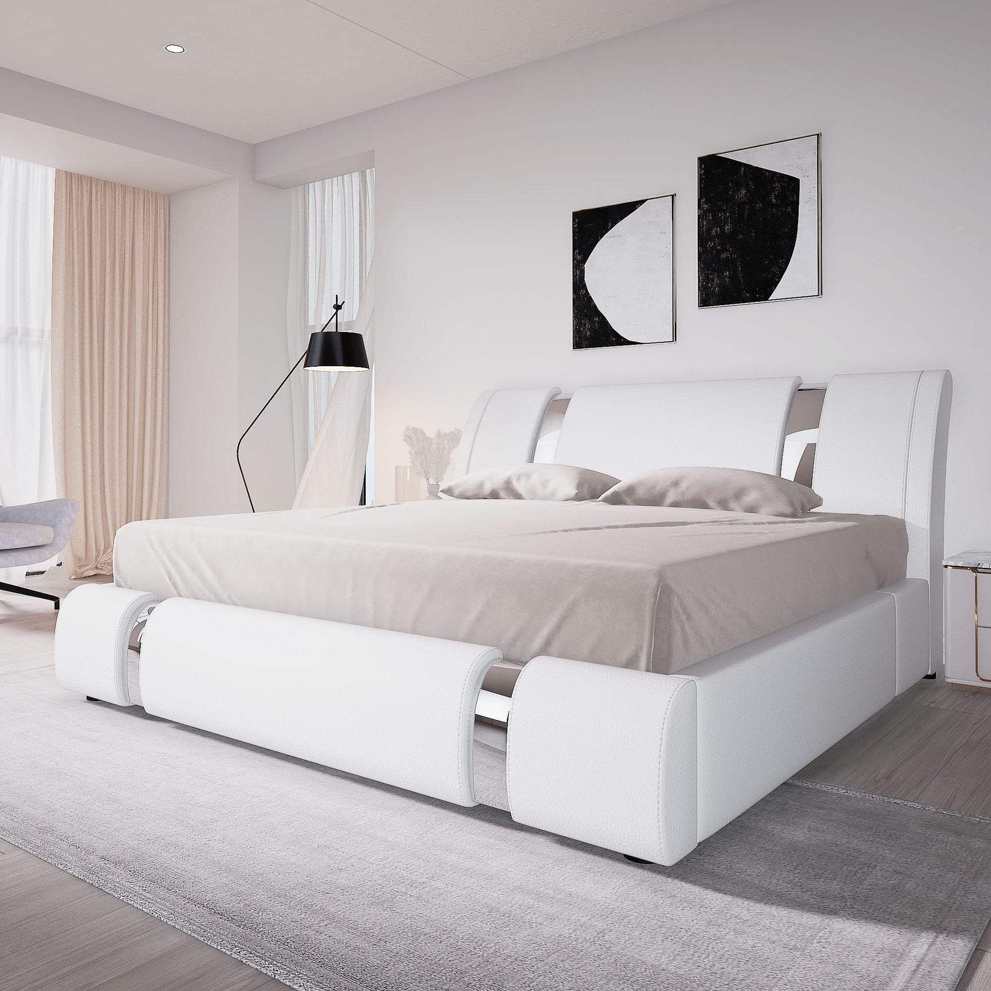 - All-Round Design: This chic platform bed frame, upholstered by lasted leather, has all-around soft surface with no sharp edges, which can protect your beloved ones.