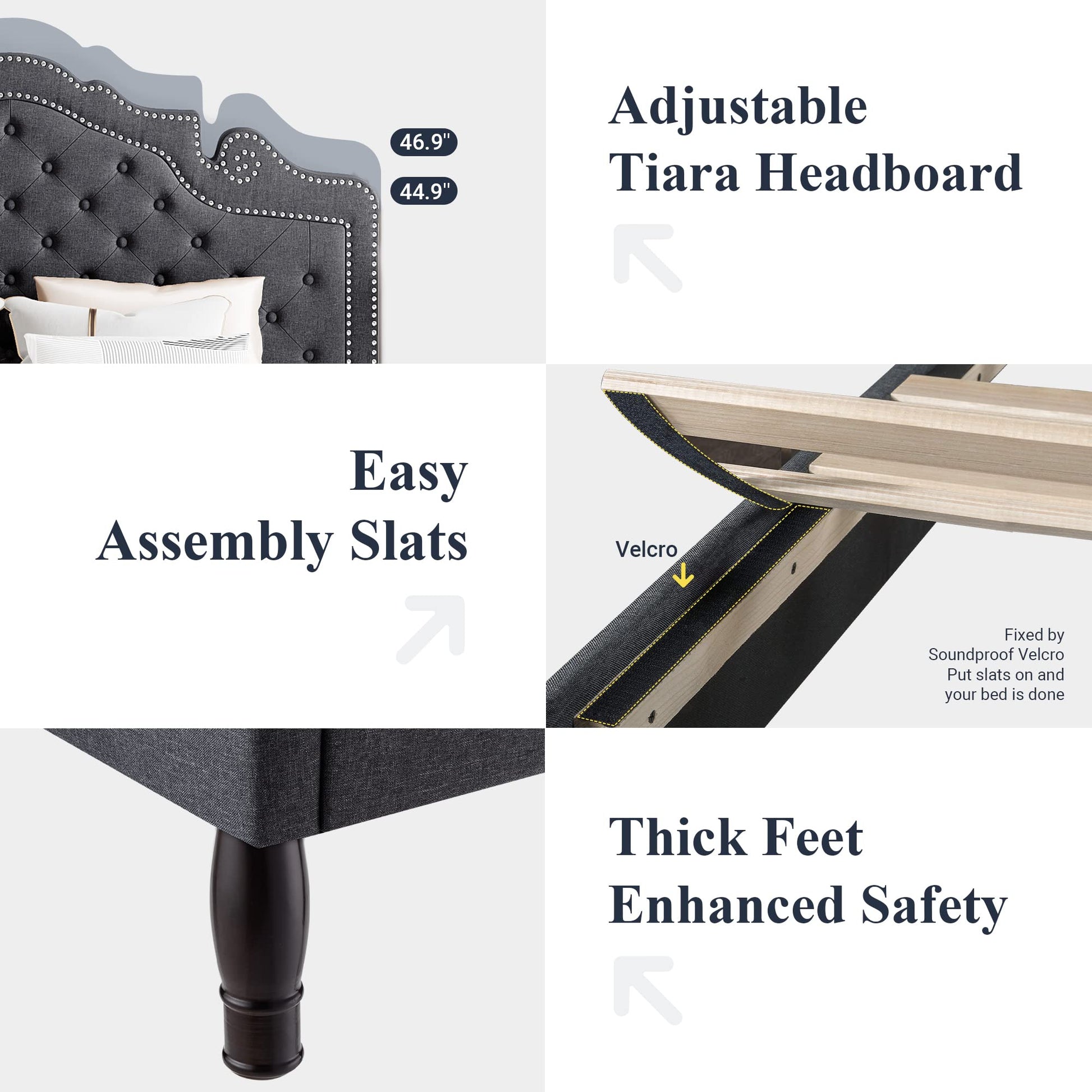 - Elegant Design: The queen bed frame with headboard is beautifully upholstered in a soft and luxurious fabric and features a tiara nailhead trim design, used Eco-friendly materials not only add style and touch of glamour but are a perfect fit for any bedroom decor, but from classic to contemporary.