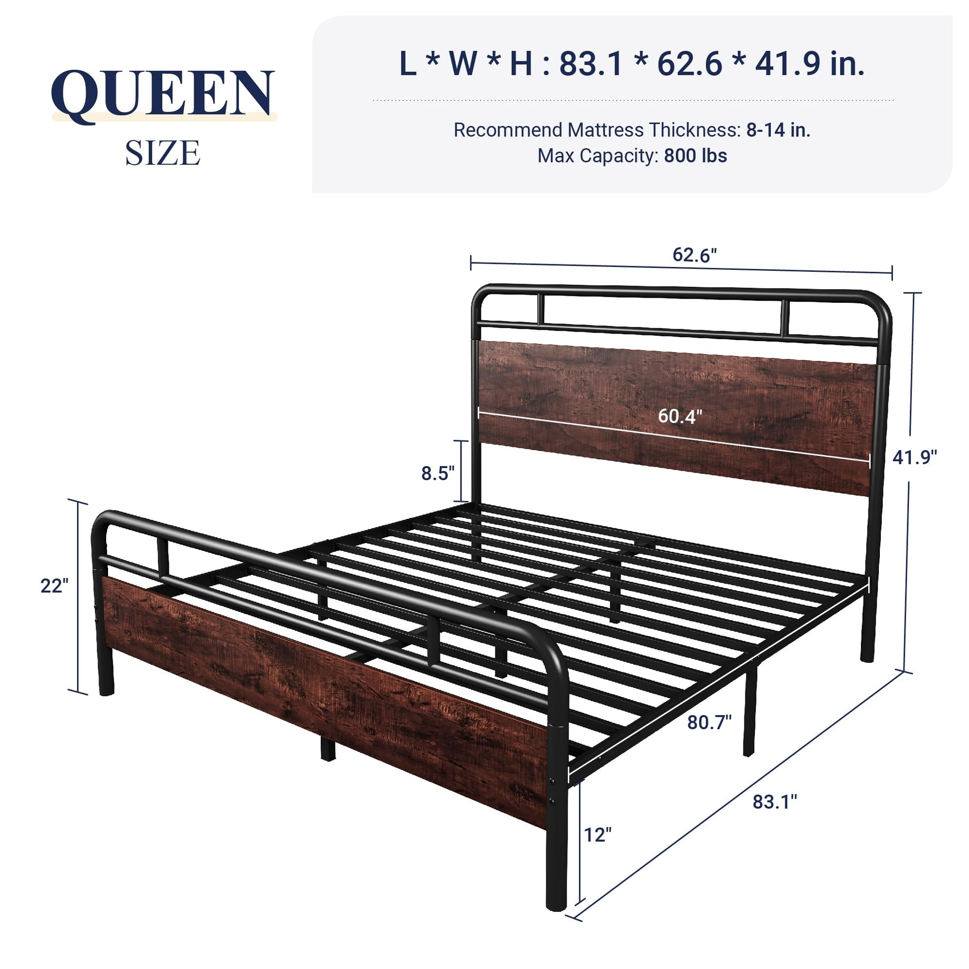 - Strong Support: Enjoy reliable mattress support up to 800 lbs with the heavy-duty construction of 13 metal slats, making this queen size bed frame with headboard and footboard an ideal choice for those who prioritize durability.