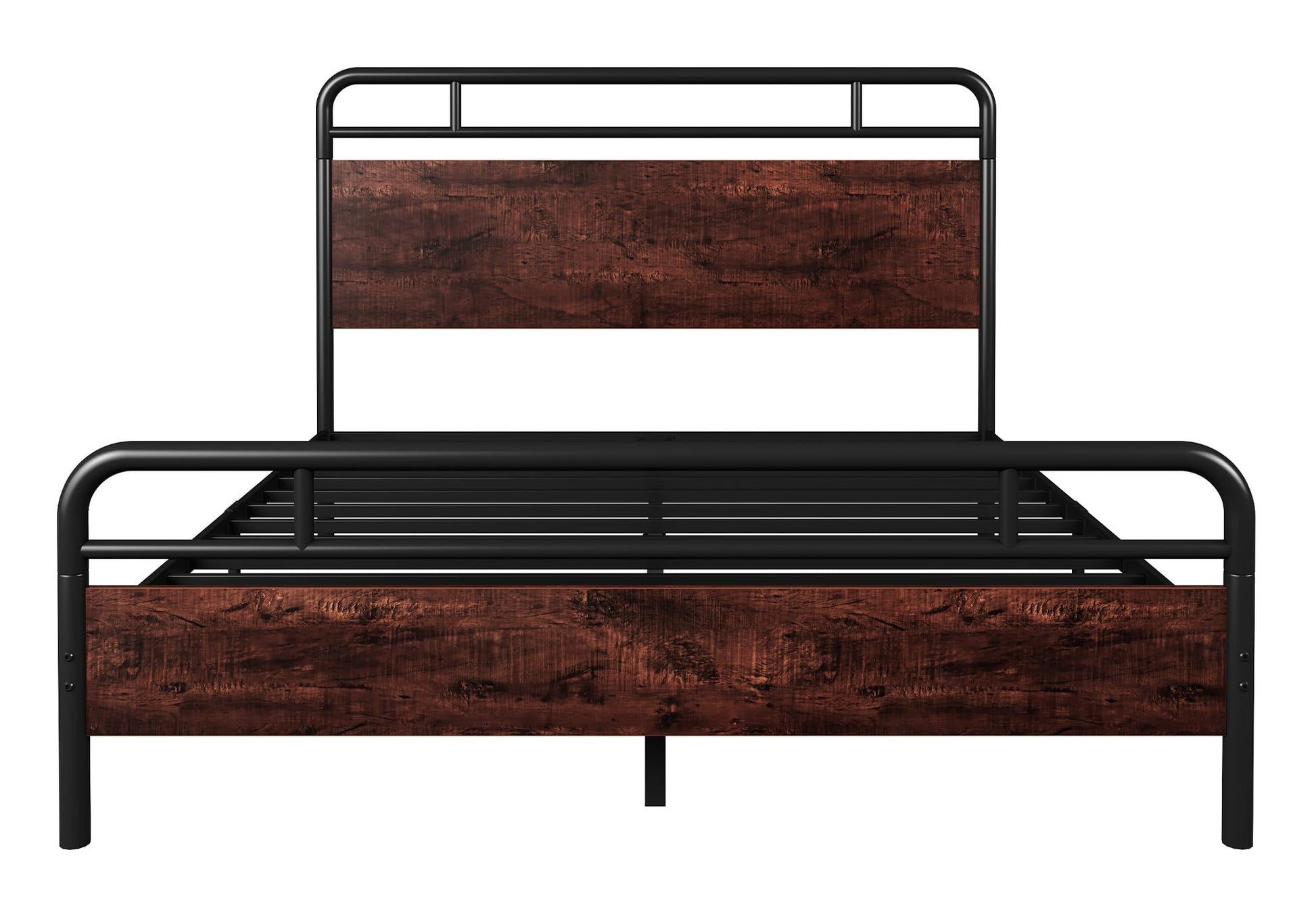 - Unique Industrial Design: Immerse your room in distinctive individualism with the combination of a rustic-style headboard and footboard paired with retro black metal pipe frame featuring rounded corners. This unique designed queen bed frame infuses an industrial flair into your space, while the headboard, crafted from a waterproof and scratchproof wood board, adds durability and style to your surroundings.