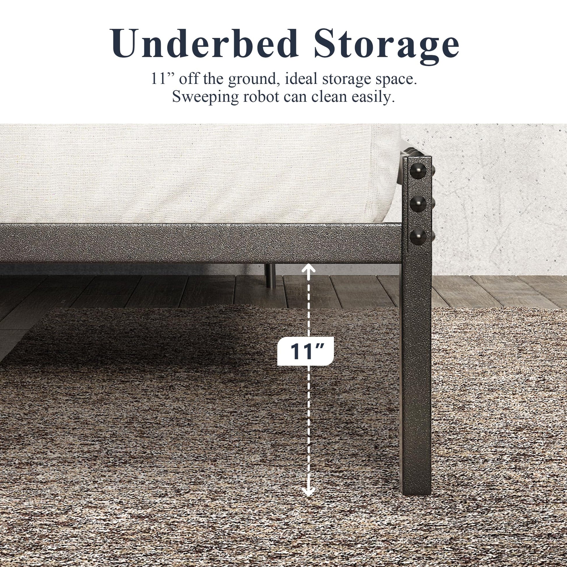- Extra Storage Space: The metal frame bed is 11 inches above the ground and can be used to put our clothes, bedding, toys, etc, No limit on storage space in the bedroom anymore.