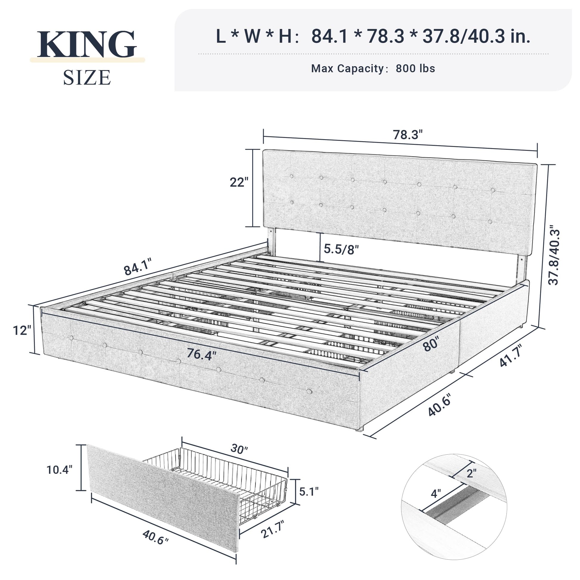 - Space-saving Functionality: With four storage drawers underneath, this bed frame king size offers perfect storage space for bed sheets, accessories, off-season clothing, etc.