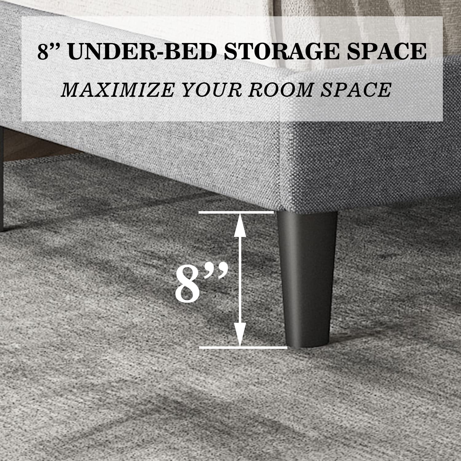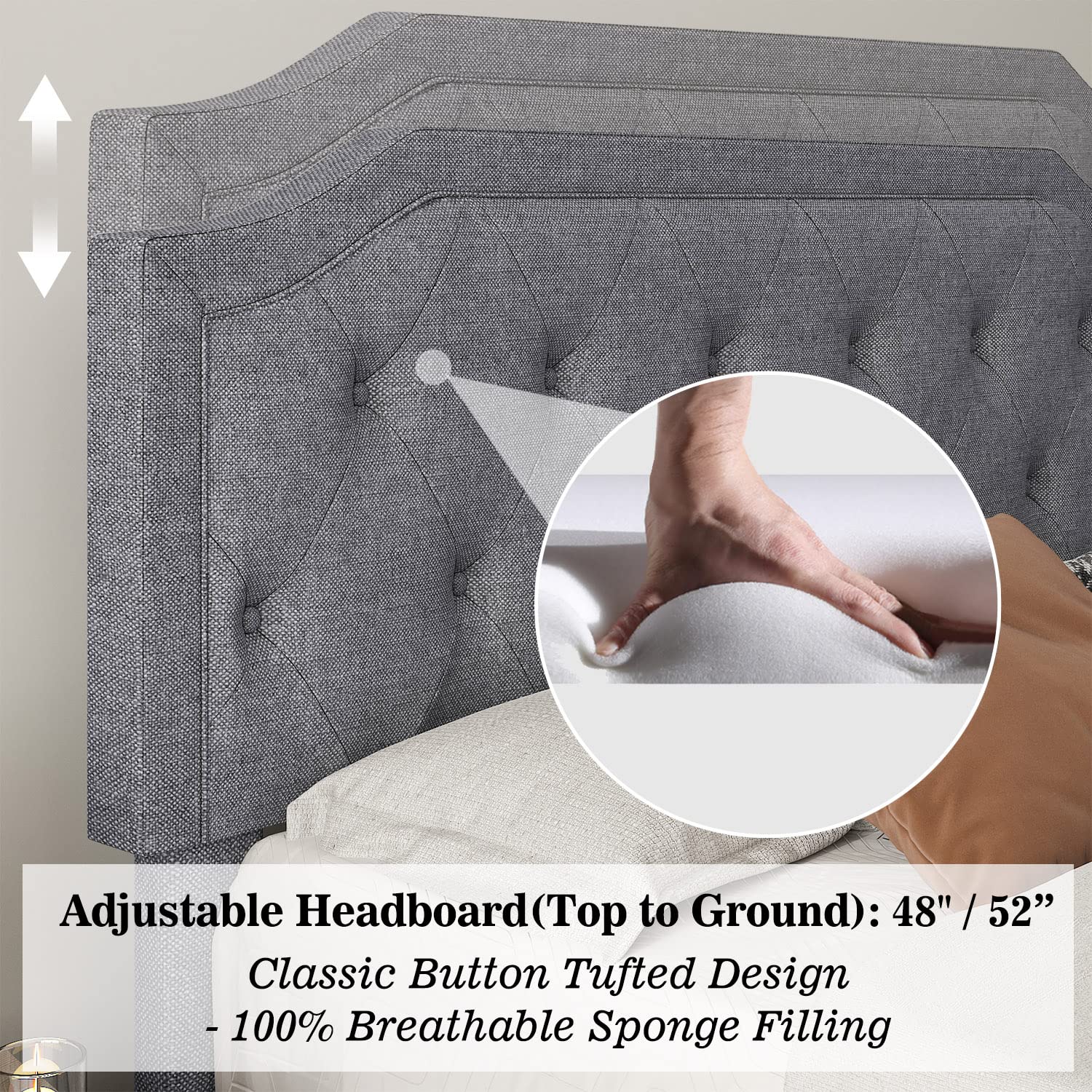 - Adjustable Upholstered Headboard: The headboard with a height of 48''- 52''inches is thickly upholstered to provide you with a comfortable backrest function.