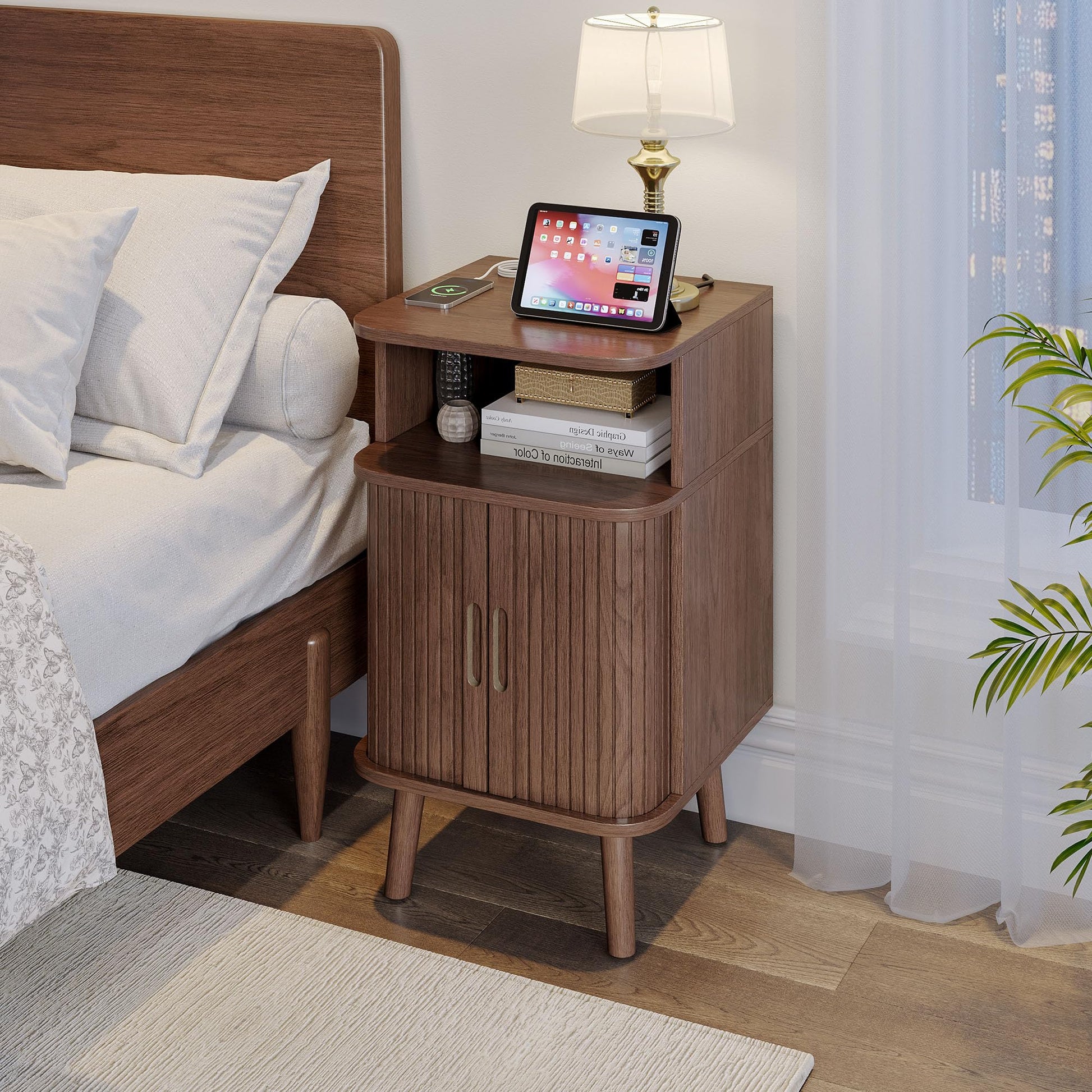 - The end side table with mid-century modern style minimalist aesthetics with unique walnut grain and the fluted doors with smooth stripe design, which adds a stylish and elegant vibe to your home and is suitable for various furniture styles. The sliding door of modern nightstand is easy to push and pull to the sides without taking up extra space, making it a ideal choice for bedside table in the bedroom or a end table in the living room