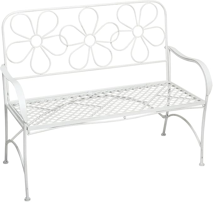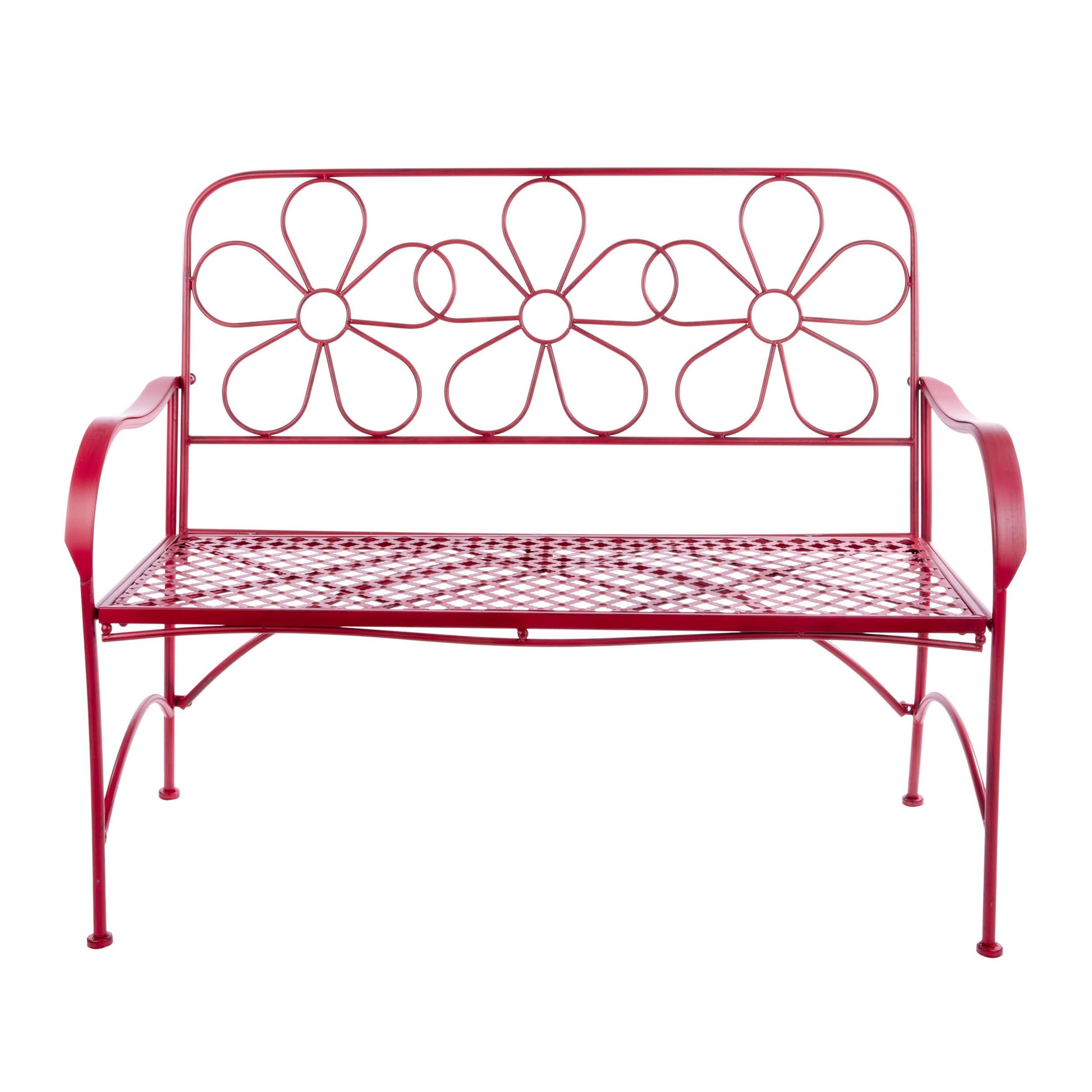 - INDOOR OUTDOOR METAL GARDEN BENCH: Features a decorative backrest with daisies in a bright red finish to provide stylish seating both inside and outside for up to two people