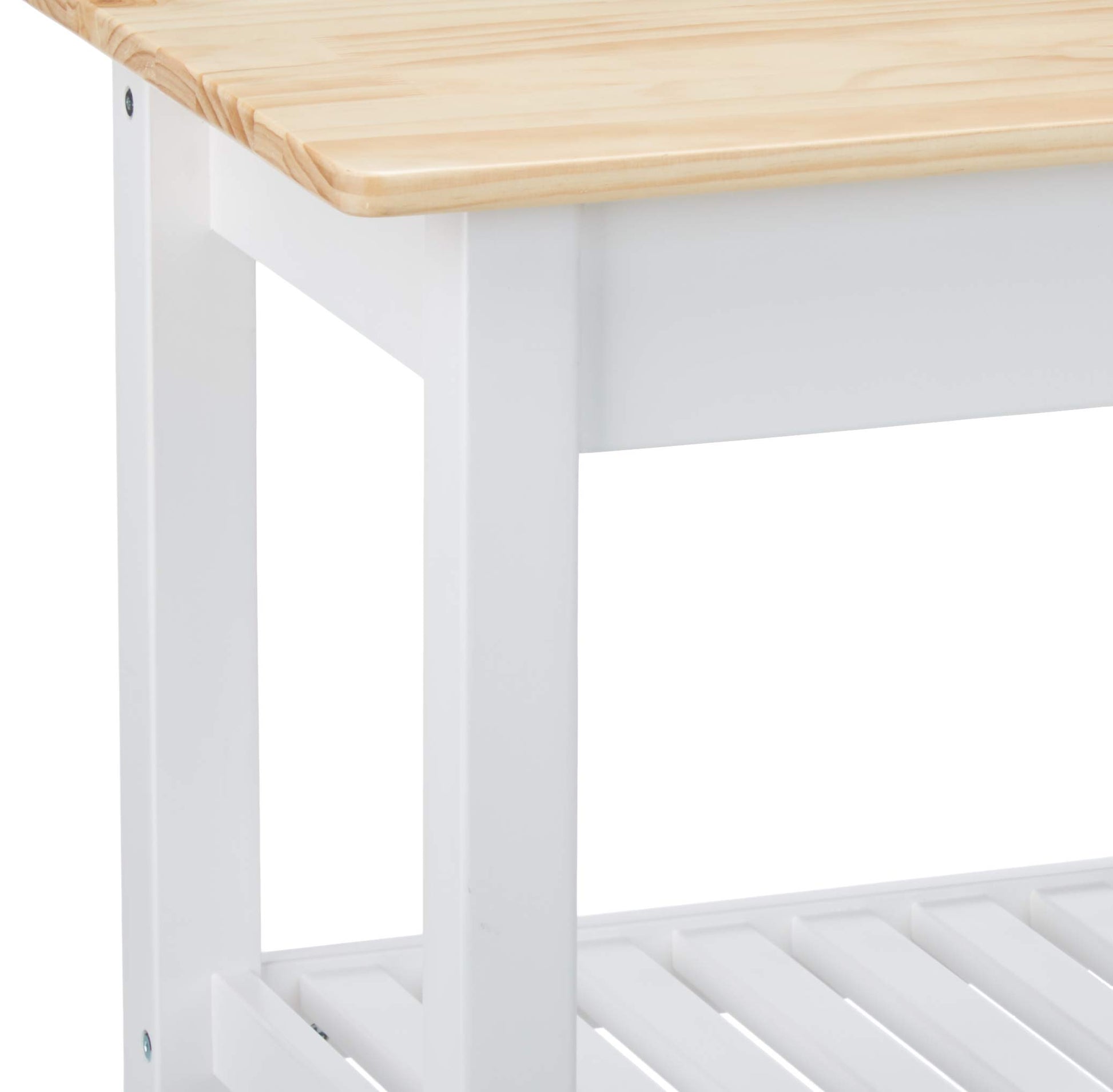 - Stainless steel hardware, white legs and shelves, natural-finish wood top