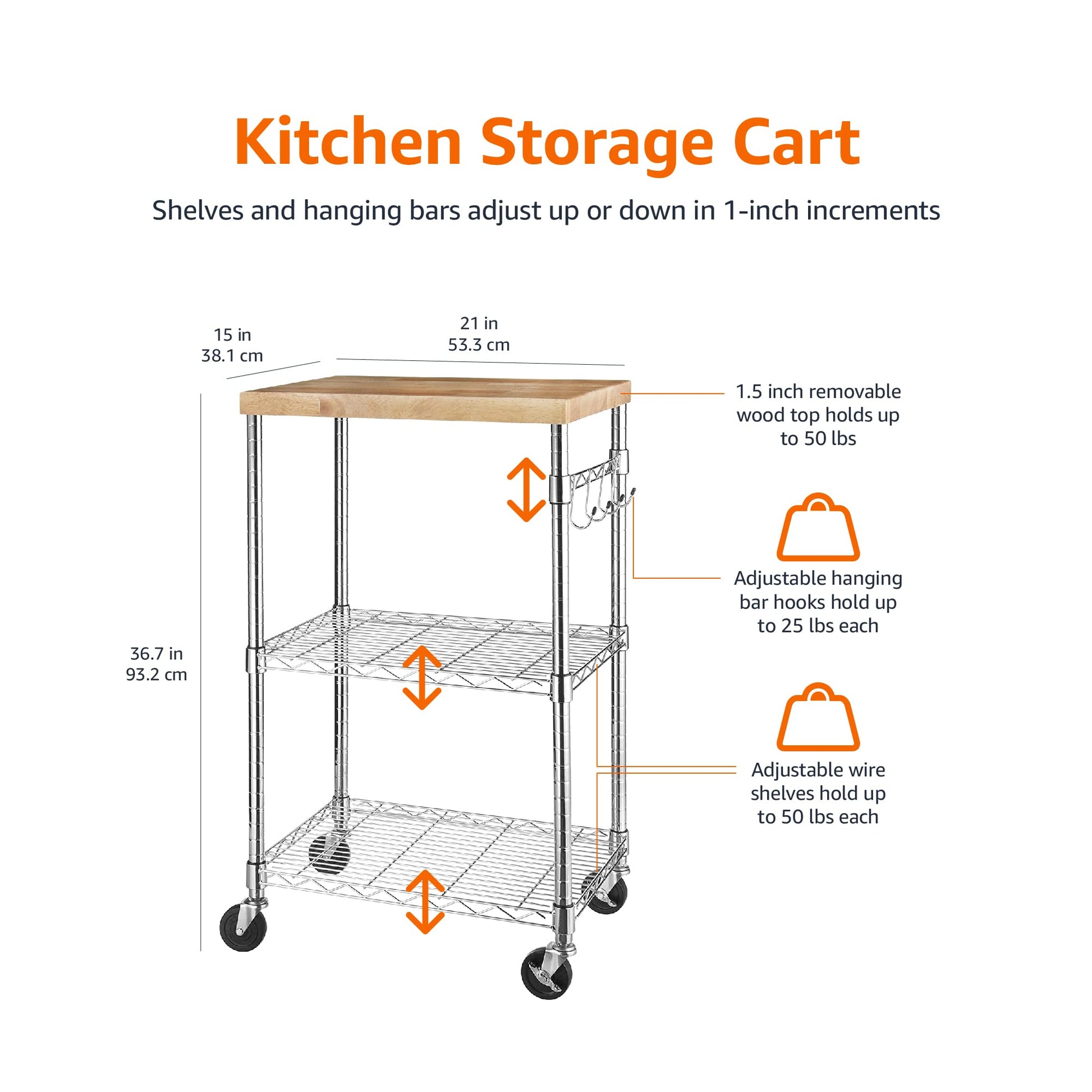 - Chrome-plated steel frame with 2 chrome shelves and a 1.5-inch wood top; each shelf holds up to 50 pounds; 175 pound total capacity