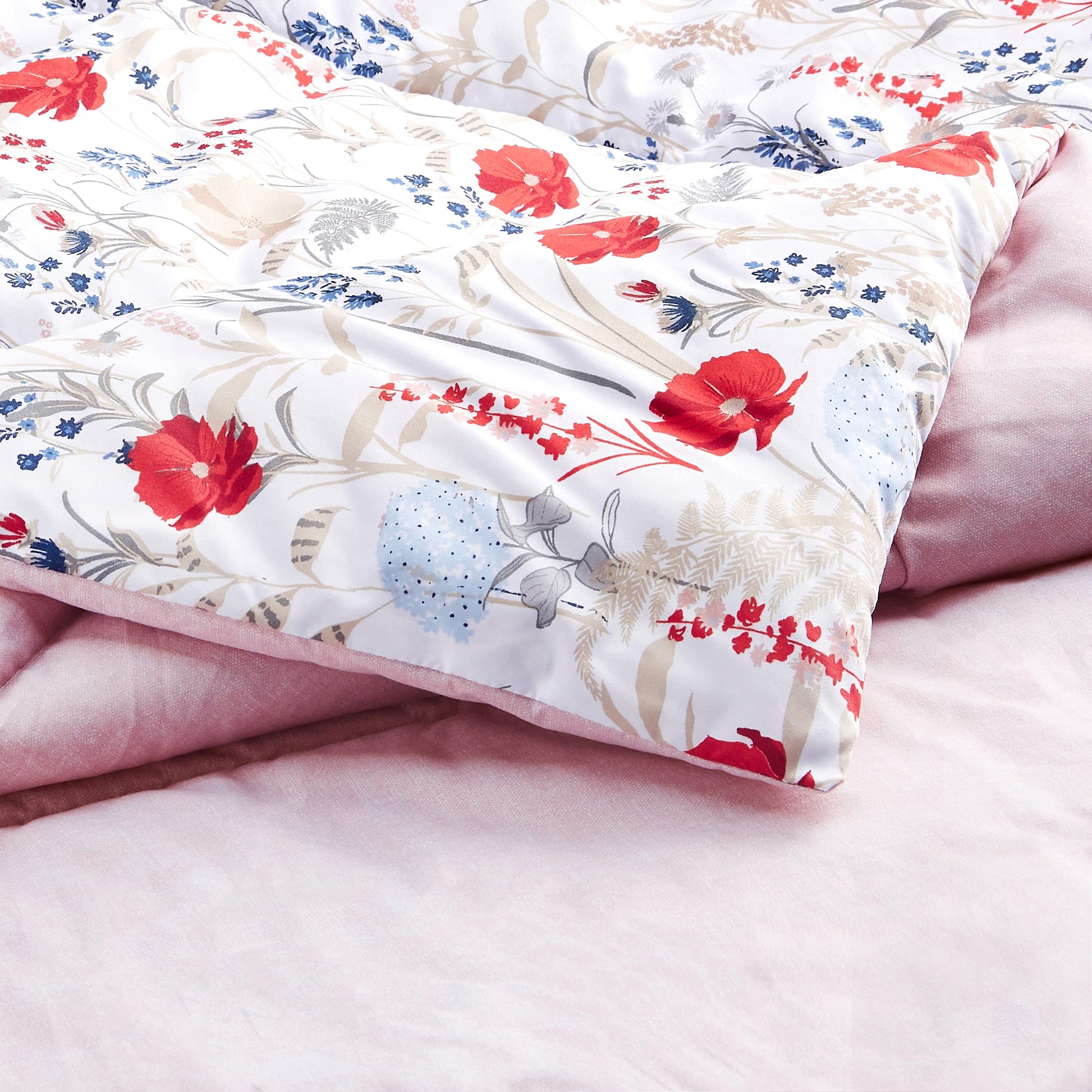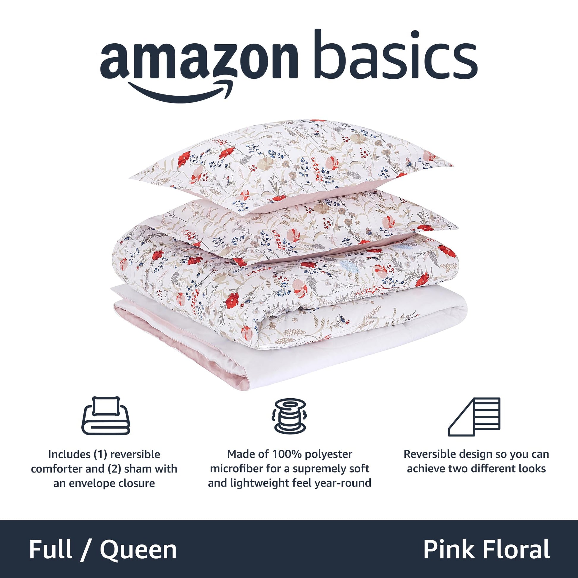 - Includes a Full/Queen-size set in Pink Floral with (1) 90 x 90-inch reversible comforter and (2) 20 x 26-inch shams with envelope closures