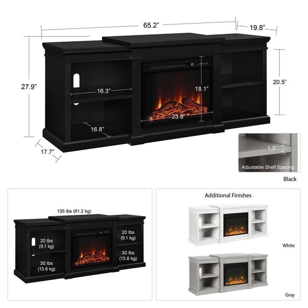 - Each fireplace TV console ships flat and needs assembly. The top supports up to 135 lbs, adjustable shelves up to 20 lbs, and fixed shelves up to 30 lbs. Assembled dimensions: 27.94"H x 65.19"W x 19.81"D. Two adults recommended for assembly