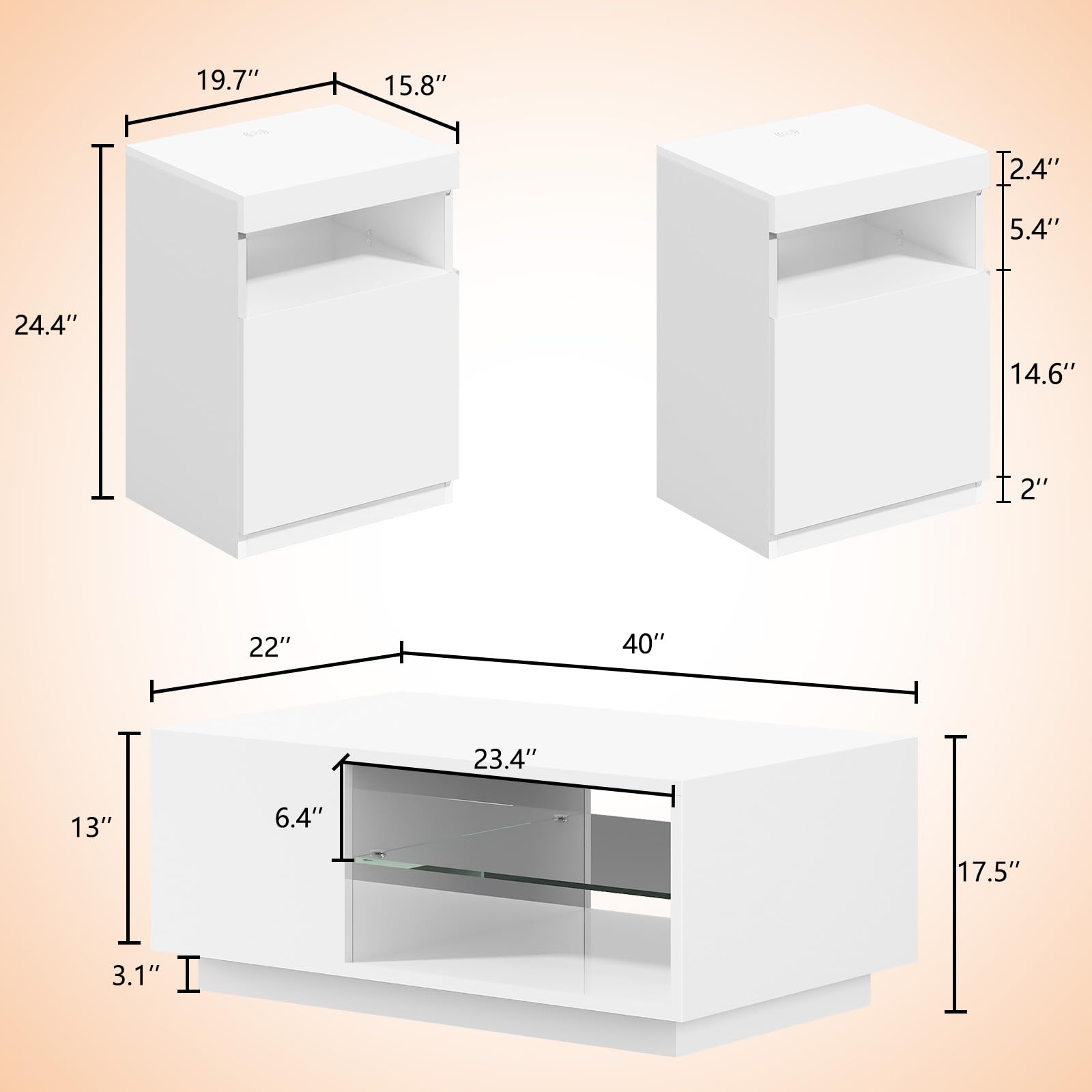3-Piece Modern High Gloss LED Table Set, Coffee Table with 20-Color LED Lights