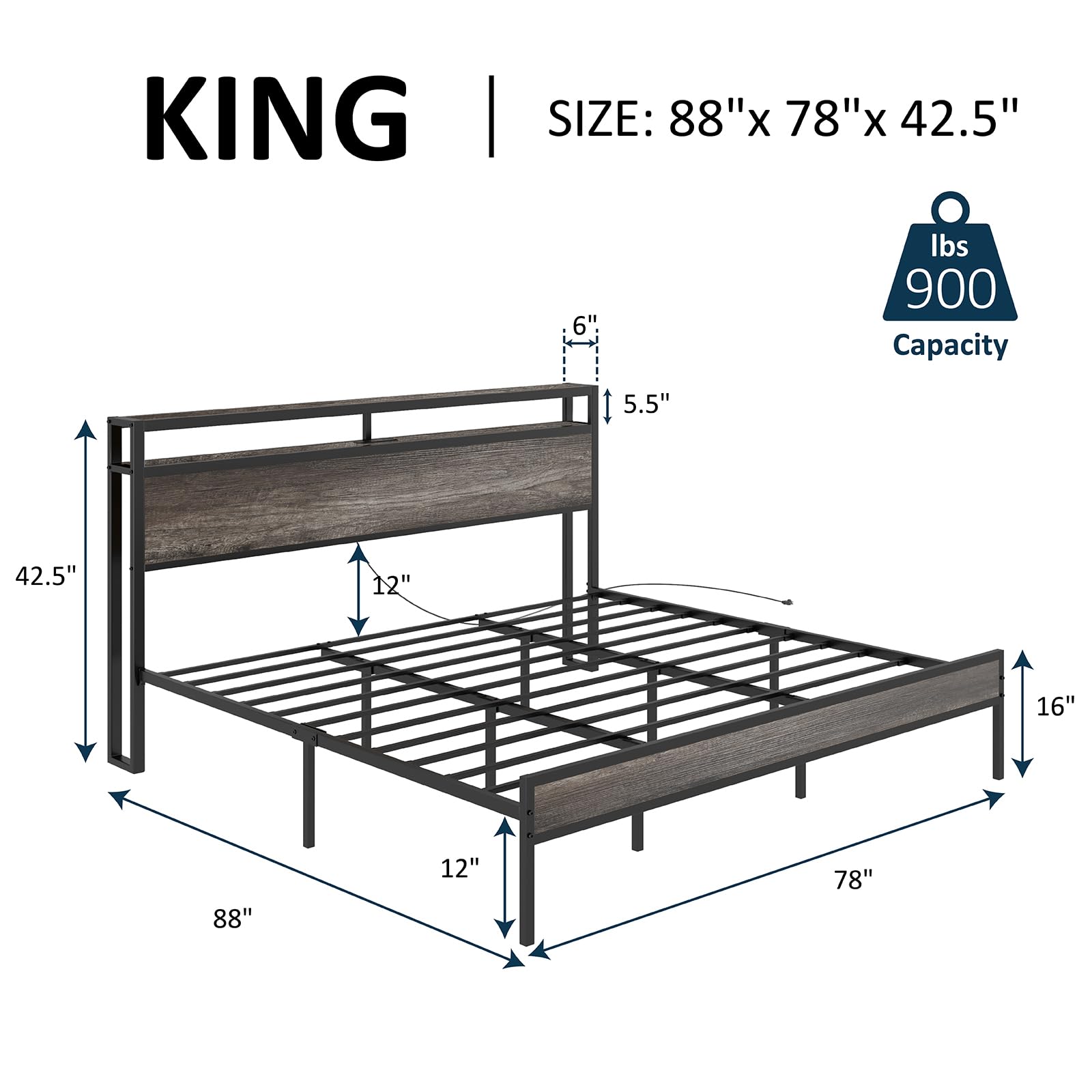 King Size Bed Frame Industrial Platform Bed with Charging Station, 2-Tier Storage
