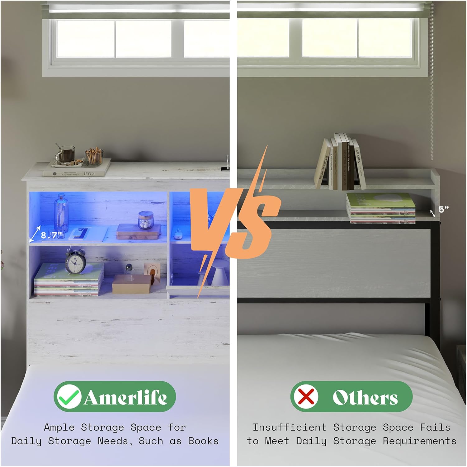 - CHARGING STATION & LED STRIPT INCLUDED: ETL & UL Certified, built in 2 Standard Plug Outlets & 2 USB Ports charge your phone, tablet efficiently. RGB LED headboard offers 20 colors & 21 dynamic modes.