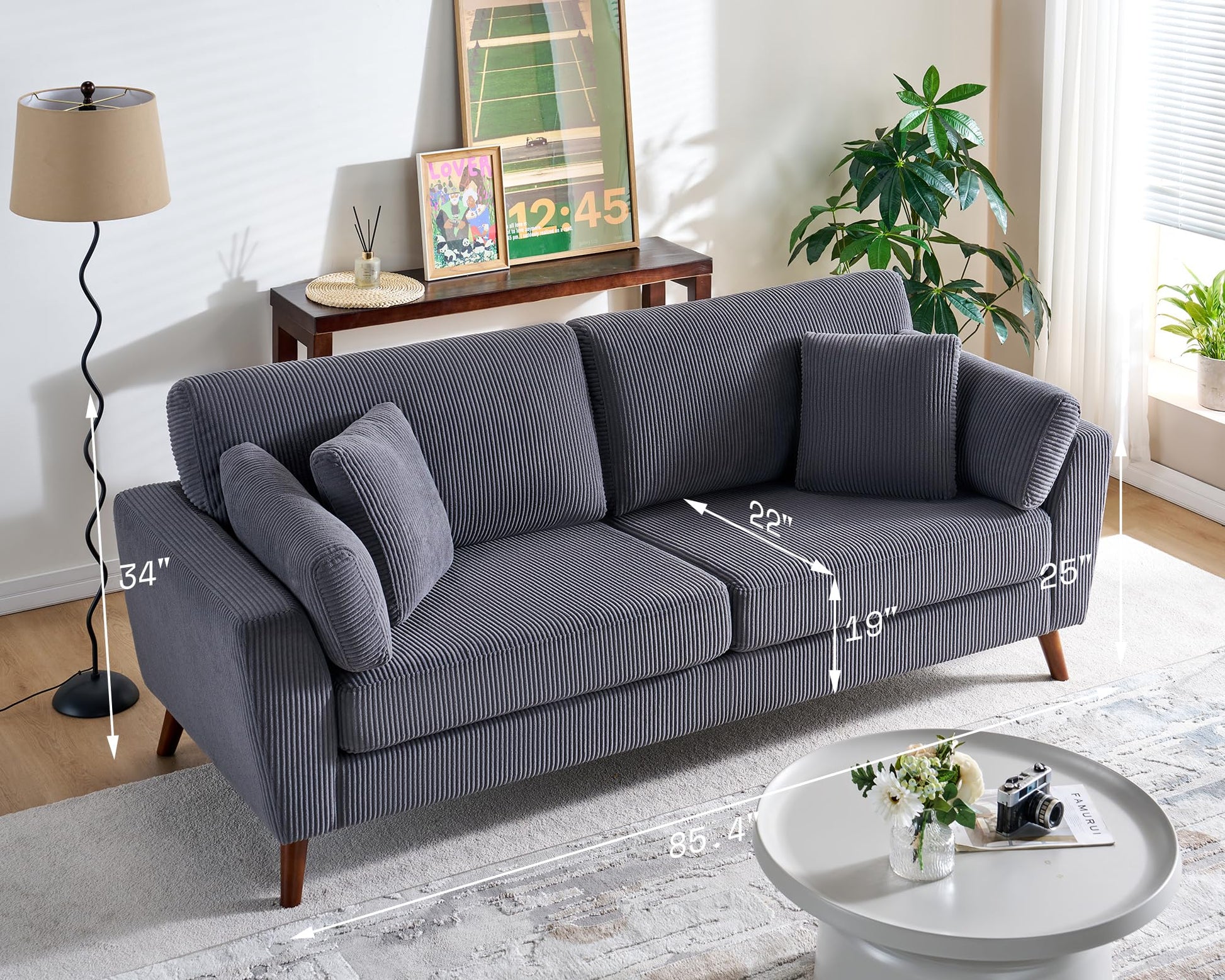 Modern Sofa, 86 inch Sofa Couch with 4 Throw Pillows, 3-Seater Sofa