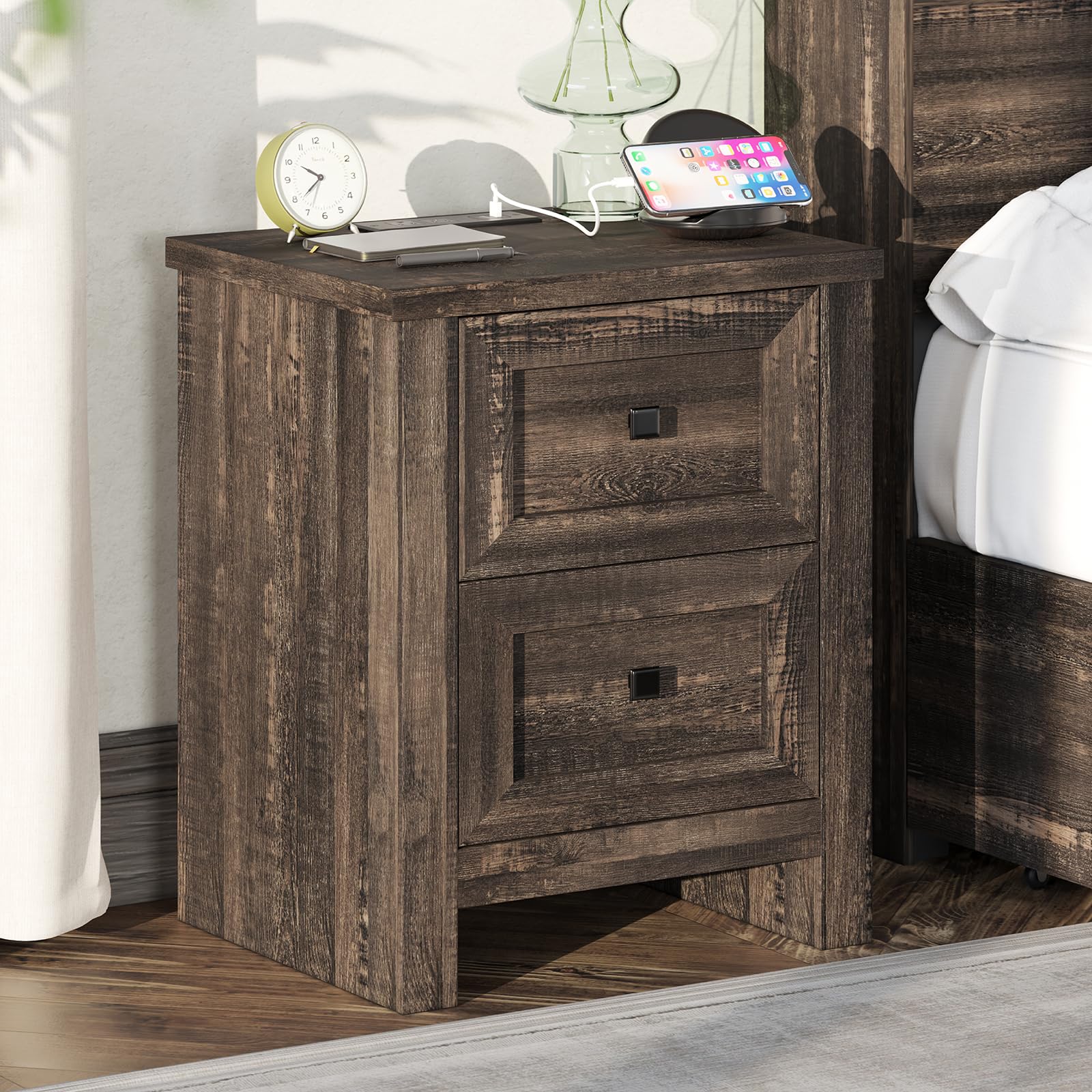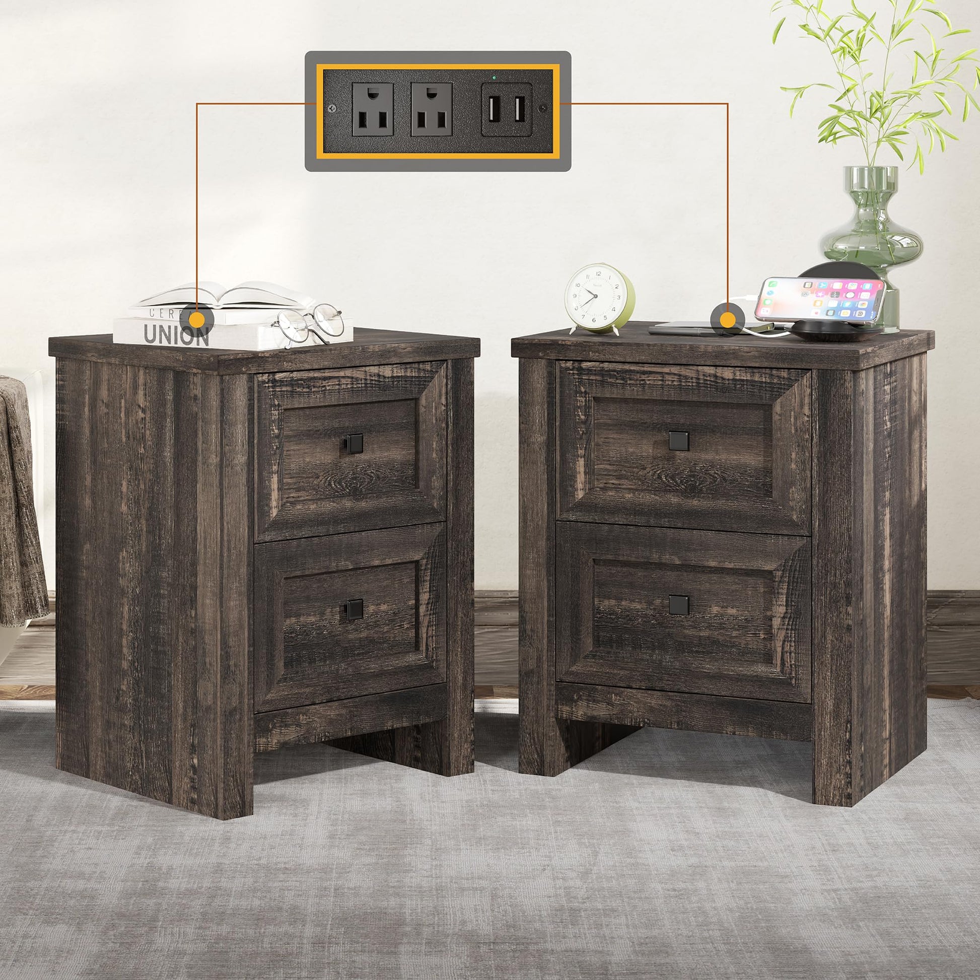 Nightstand Set of 2 with Charging Station, Rustic Bedside Table with Drawers Storage,
