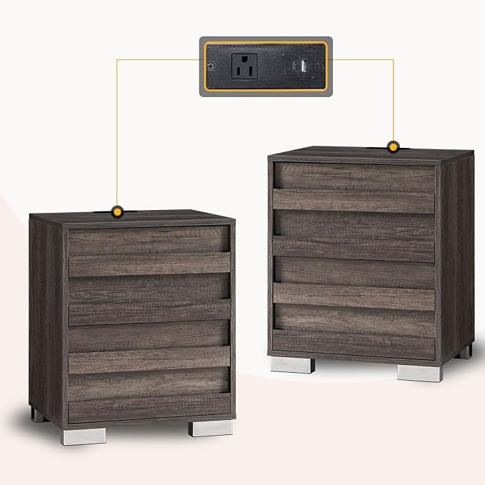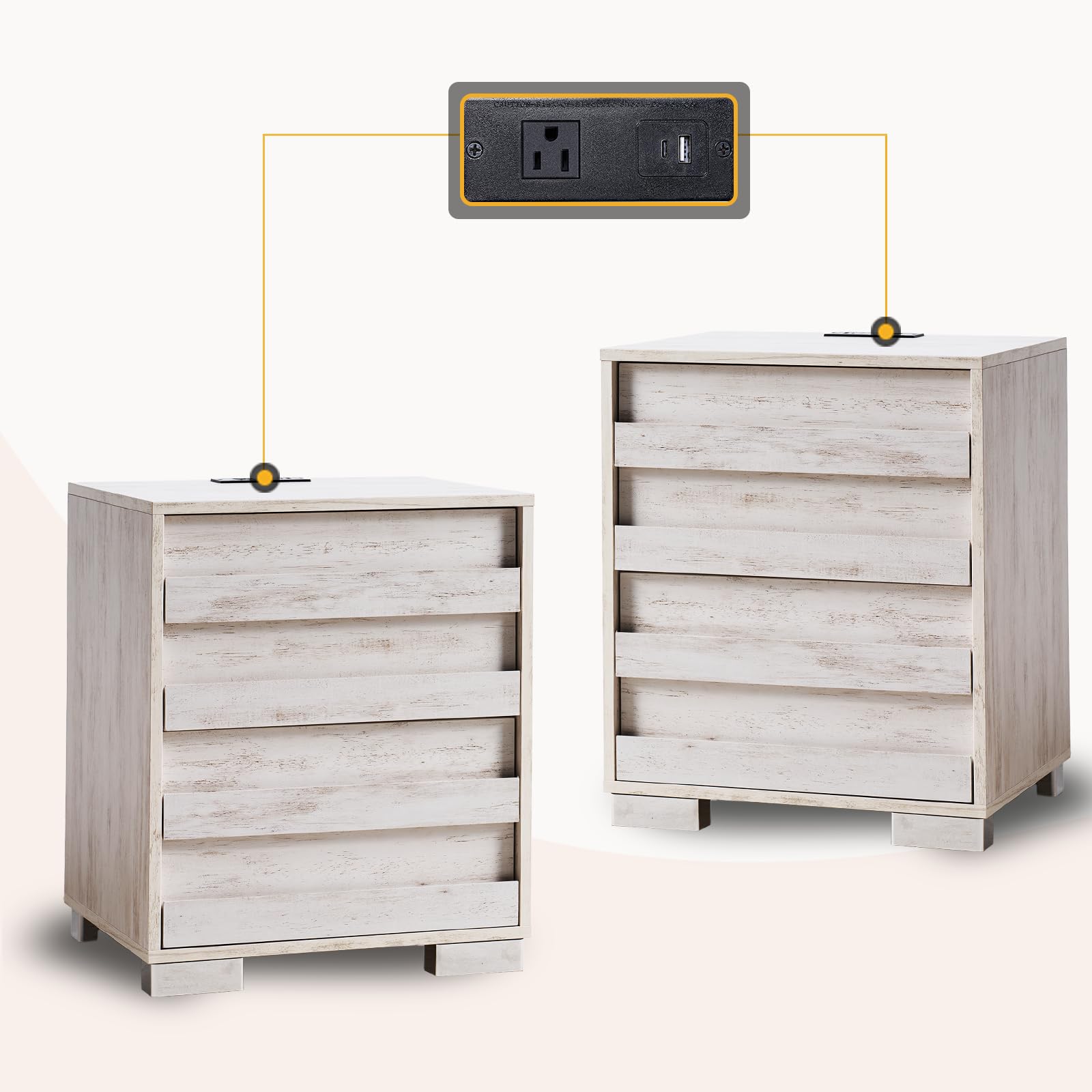 Nightstand Set of 2 with Charging Station, Wood Bedside Table with 2 Drawers