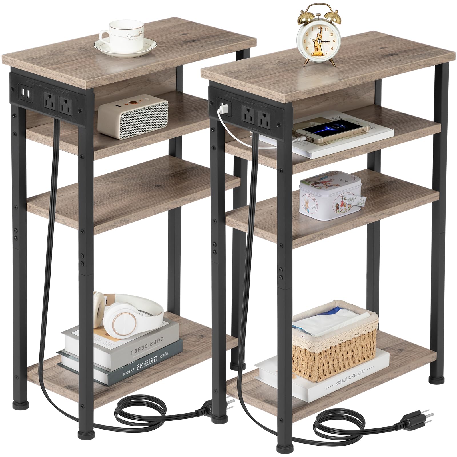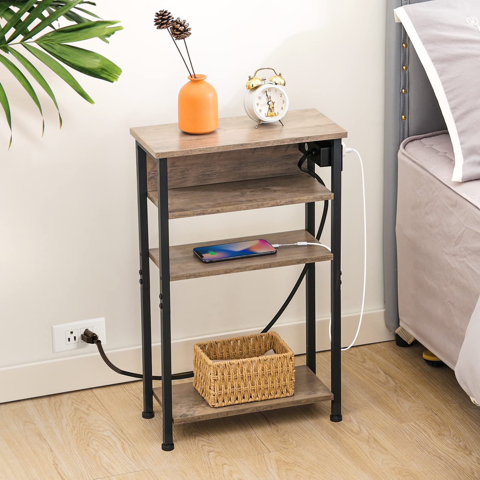 Narrow Side Table with Charging Station, End Table for Small Spaces