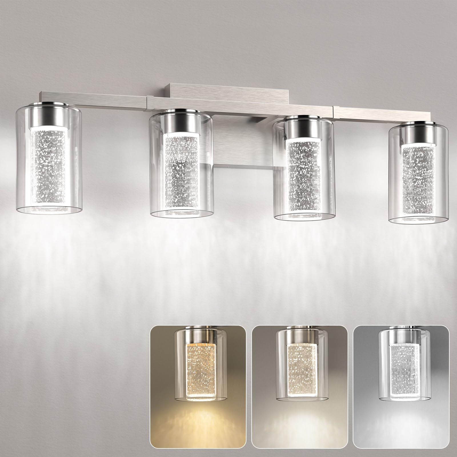 - Elegant Design with Superior Safety:This 4 heads vanity light features made of crystal bubble glass, offering a stunning and elegant appearance. The thickened explosion-proof glass ensures high transparency and safety, making it durable and shatter-resistant. The glass pillars reflect beautiful lighting effects, adding a decorative touch while providing excellent illumination.