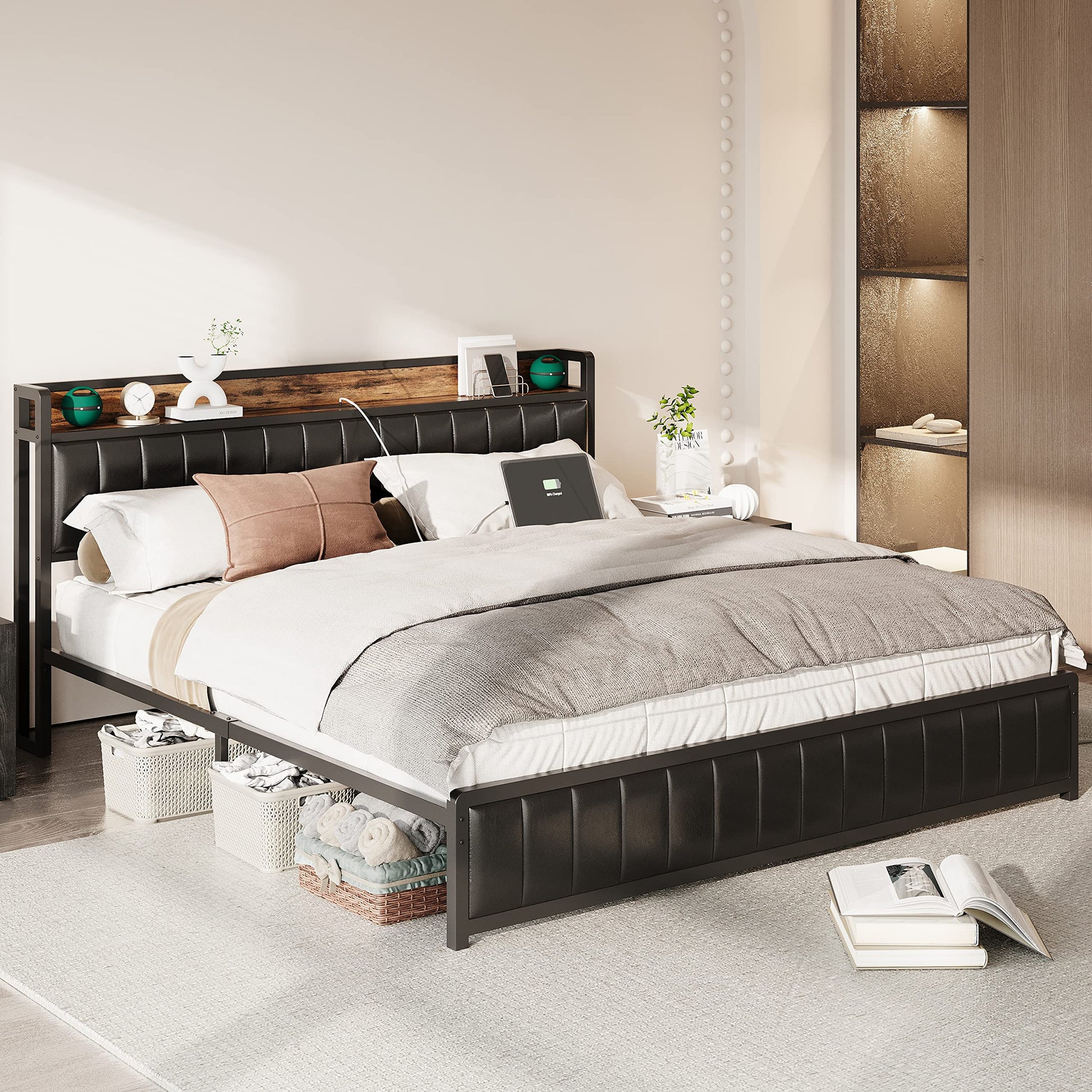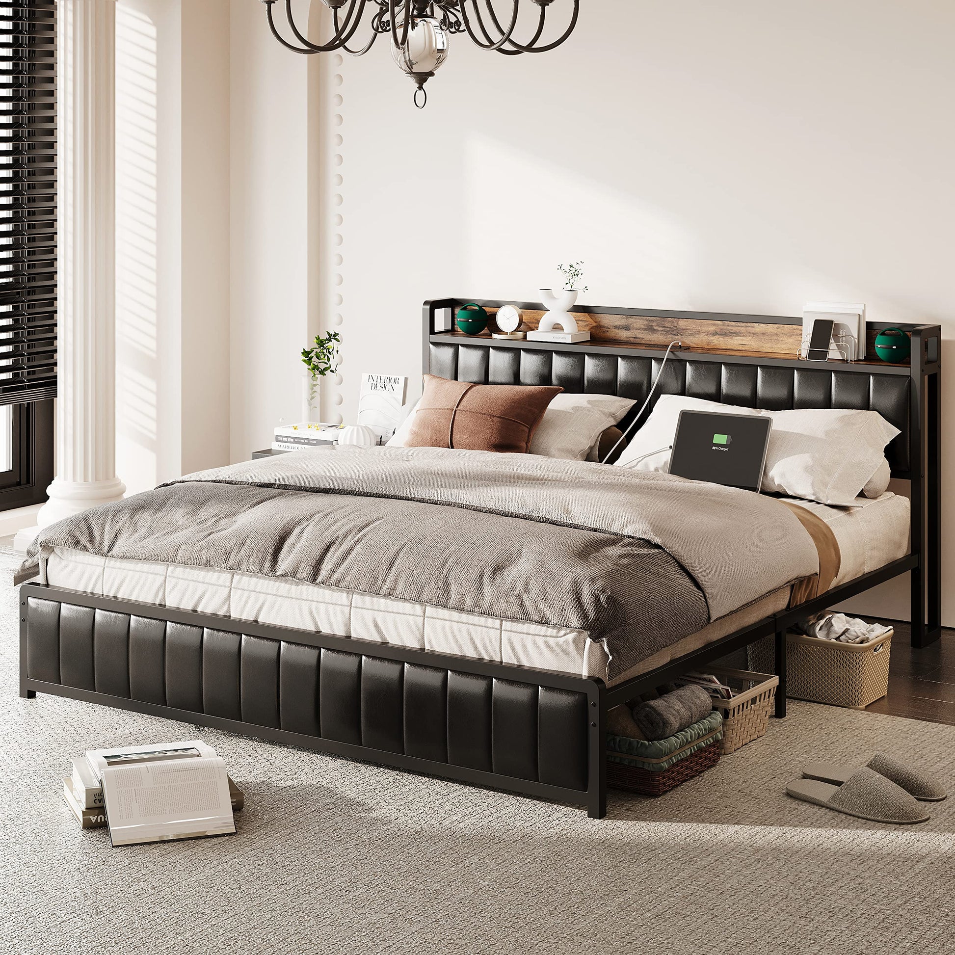 King Bed Frame with Storage Headboard & Footboard, Upholstered Platform Bed with USB