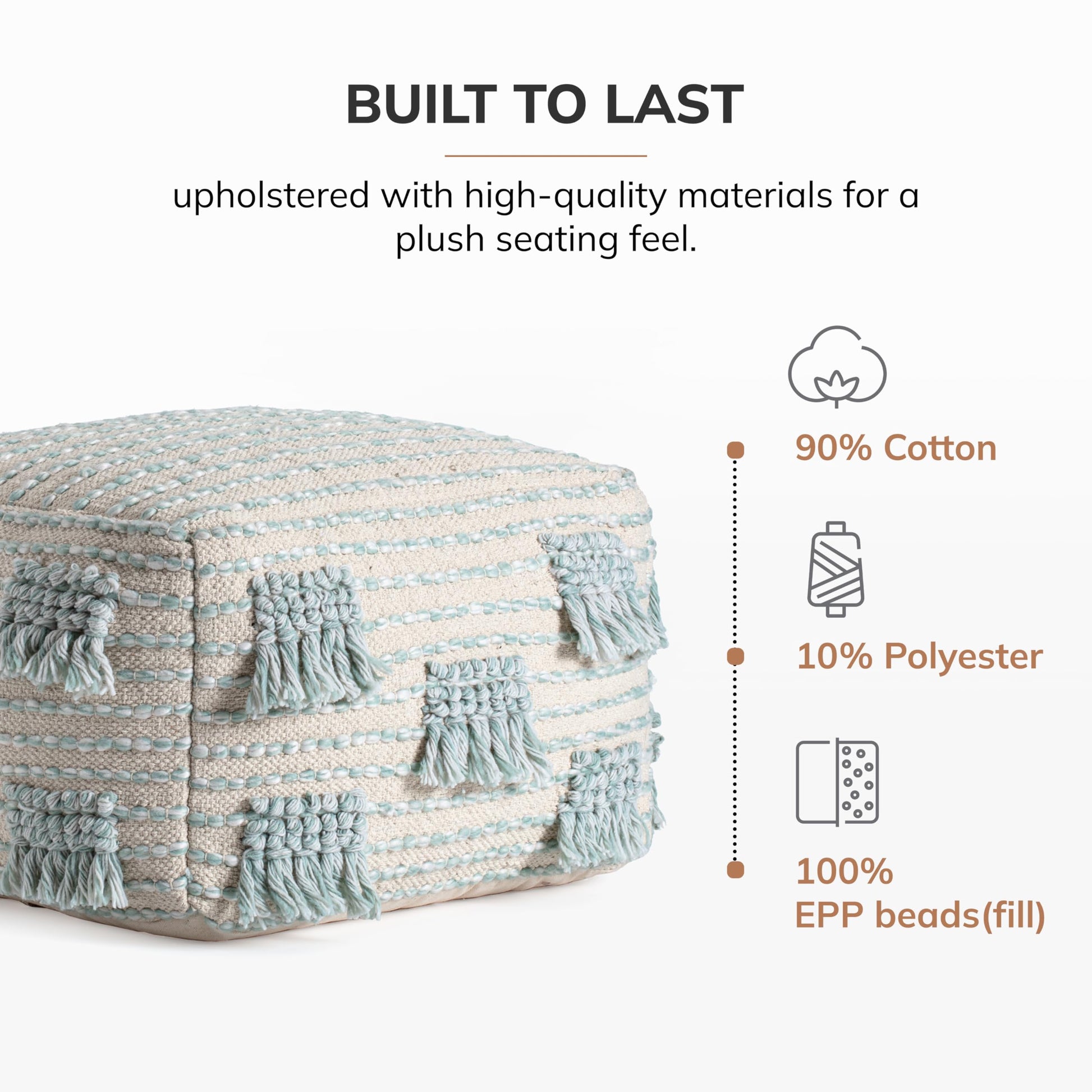 - Pre-filled EPP beads: This pouf ottoman footrest is pre-filled with firm and recyclable Expanded Polypropylene (EPP) Beads, offering both support and comfort. The EPP beads not only provide a soft seating experience but also contribute to sustainable living practices, making this stuffed pouf a smart and eco-friendly choice.