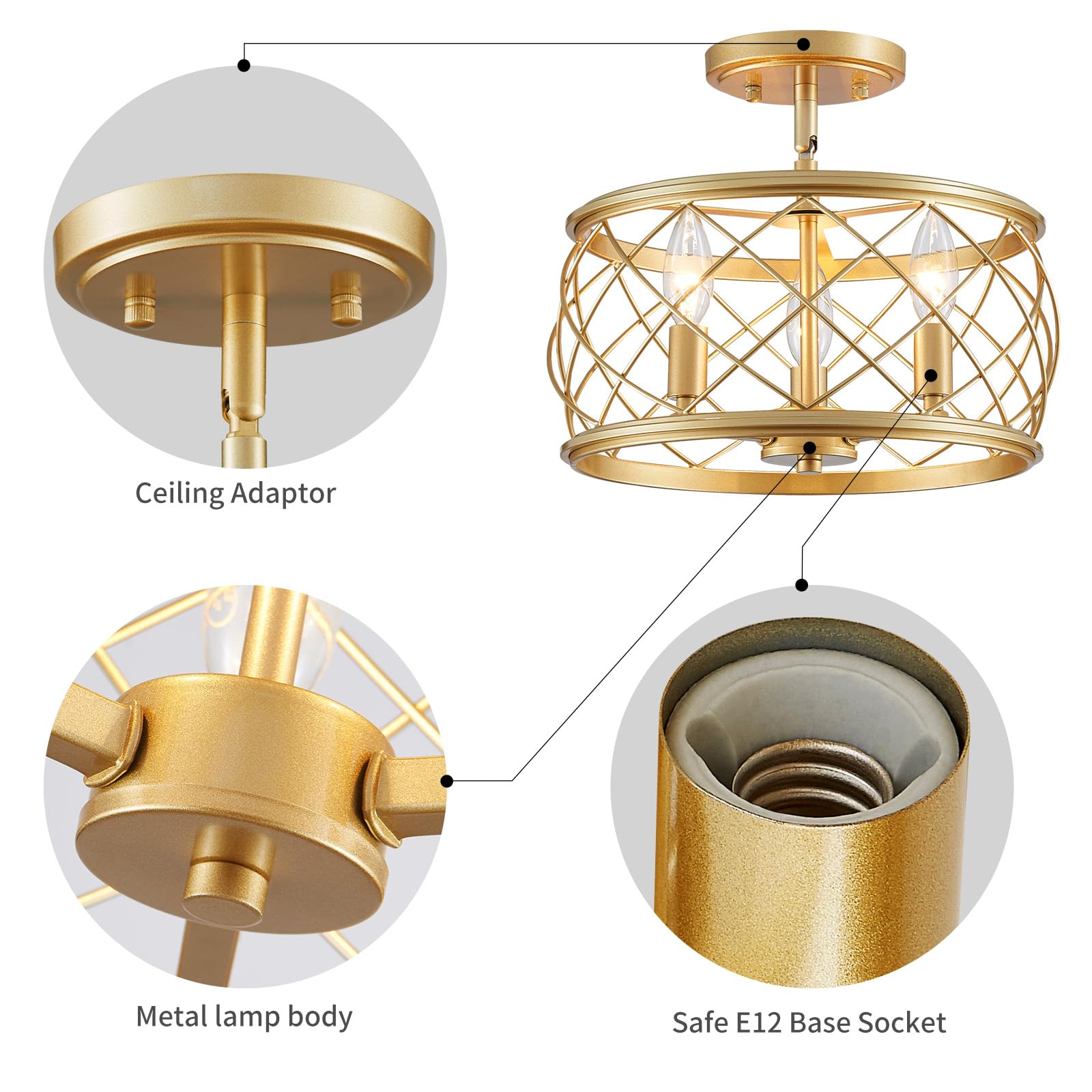 - This semi-flush ceiling light has a unique open drum frame with Golden finish, combining attractive vintage retro with modern industrial charm.