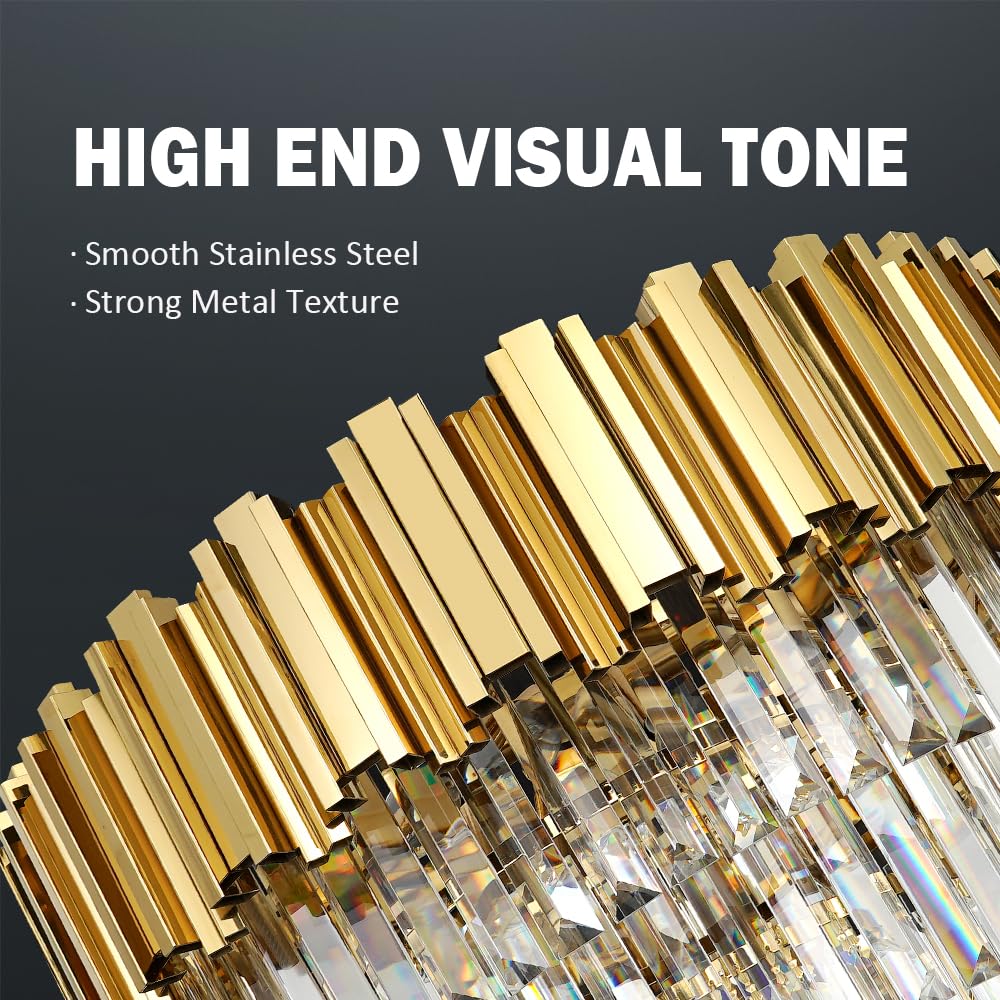 - Round Artistic Statement The chandelier is based on a minimalist design structure but maximizes the sense of luxury, fully decorated with a shiny polished golden frame and clear sparkle crystal beads rope, and rainfall, looks gorgeous, and absolutely stunning whether the lights turn on or off