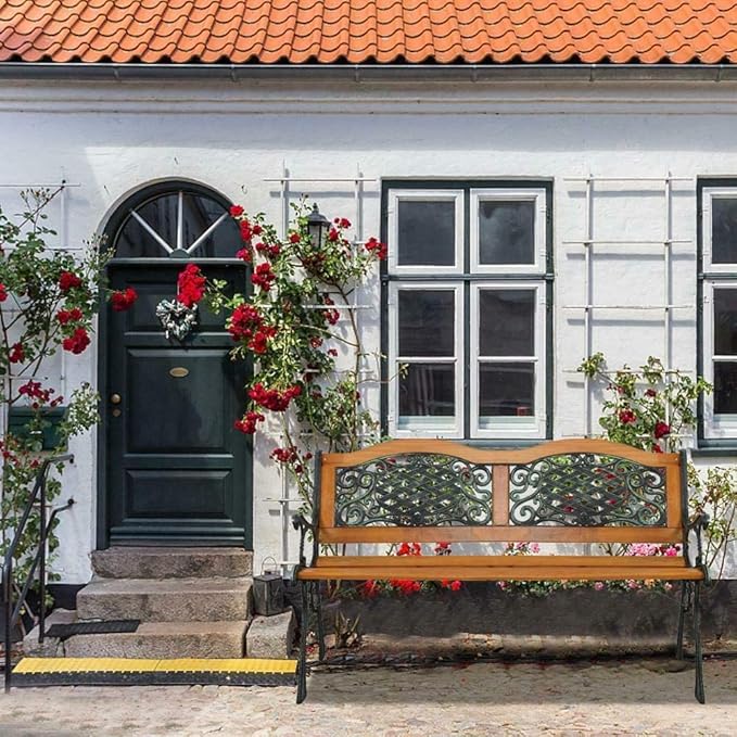 - High Quality Cast Iron & Hardwood: Our outdoor bench consists of well painted cast iron structure, solid wood seat and backrest frame, and PVC backrest pattern, make this garden bench does not rust easily and can provide you long-lasting Value