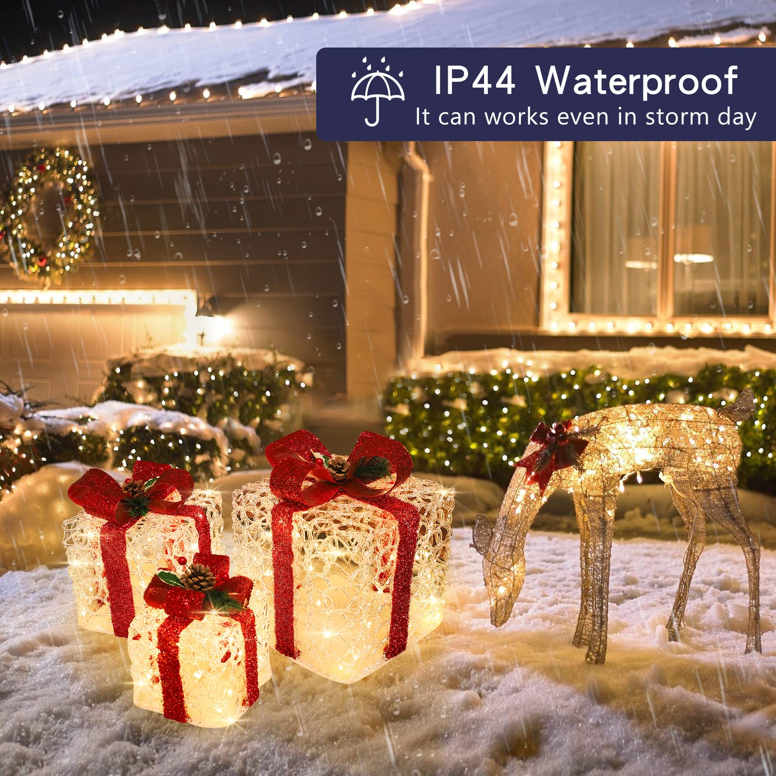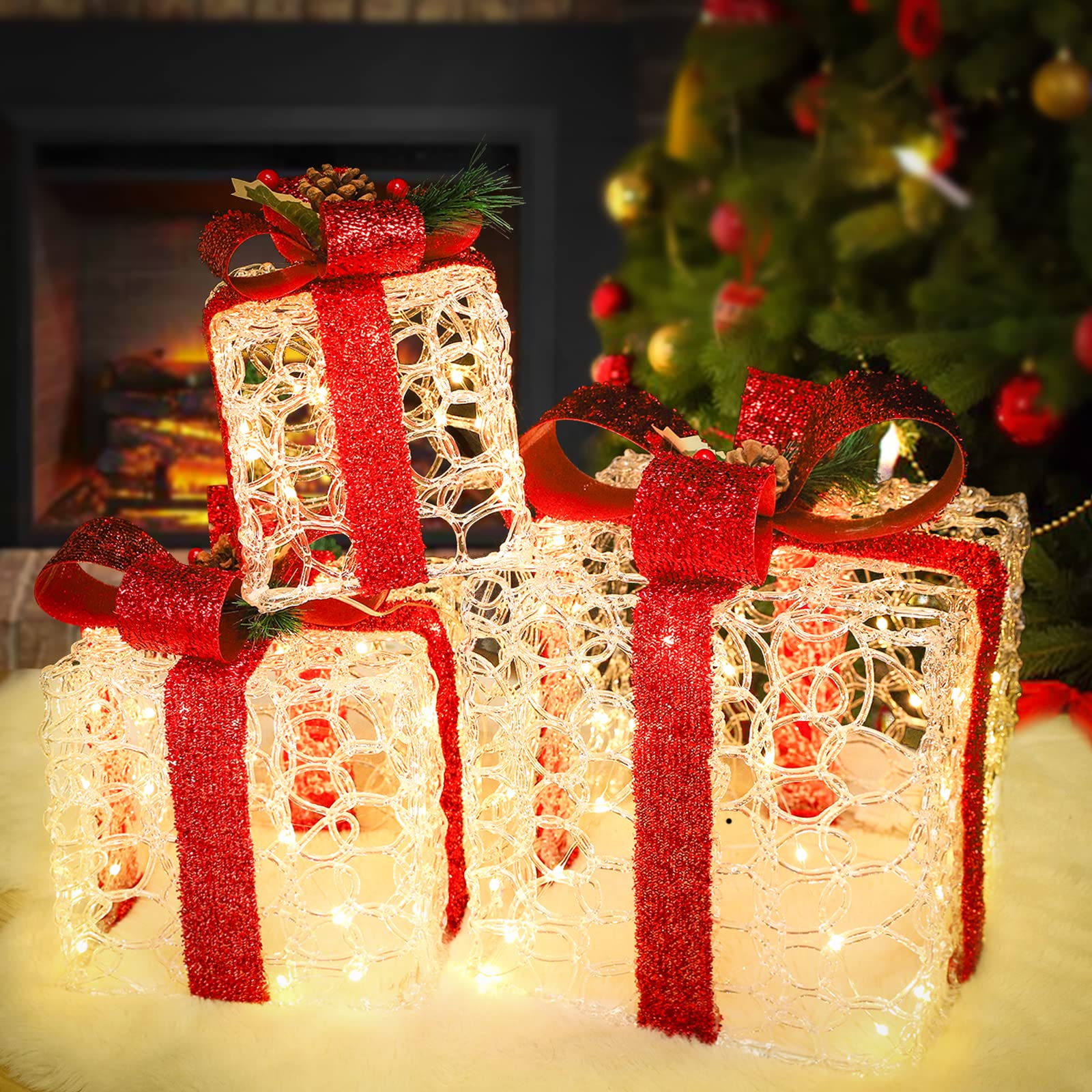 - FOLDING DECORATION Lighted Gift Boxes Christmas Decoration, 3 home light-up gift boxes side by side on the skirt or front porch of your Christmas tree, battery box switch Timer function: 6H open, 18H auto off, light them up and invite your friends or relatives to enjoy Christmas together; Note: Can be used outdoors no need to worry about breakage or rain!